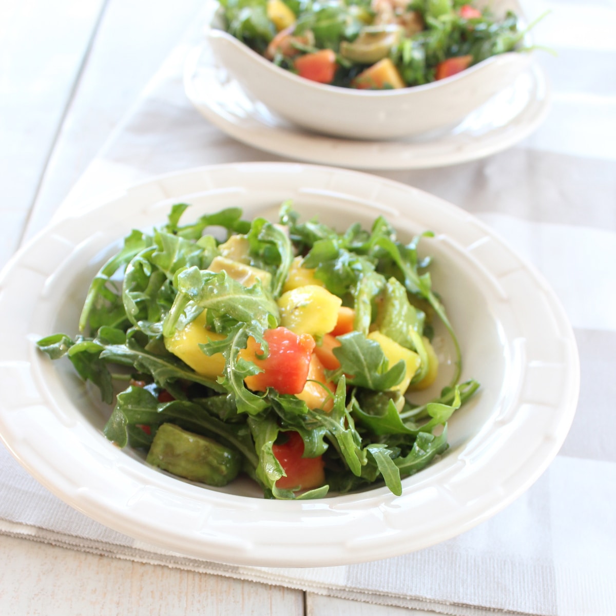 This Shrimp Mango Arugula Salad combines mango, papaya, avocado and lemon pepper grilled shrimp for a fresh, flavorful salad that is perfect for summer!