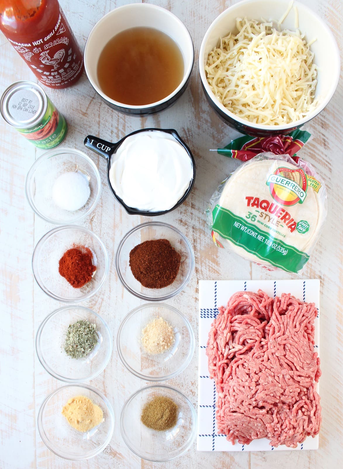 Add the chili powder, paprika, ground cumin, dried oregano, onion powder, garlic powder and salt. Mix all of the spices into the meat, then add the beef broth, sour cream, Sriracha and tomato paste, stir to combine well.