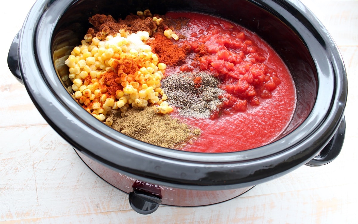 Place in a large slow cooker. Add the tomato sauce, diced tomatoes, corn kernels, chili powder, cumin, paprika, cayenne pepper, black pepper and salt.