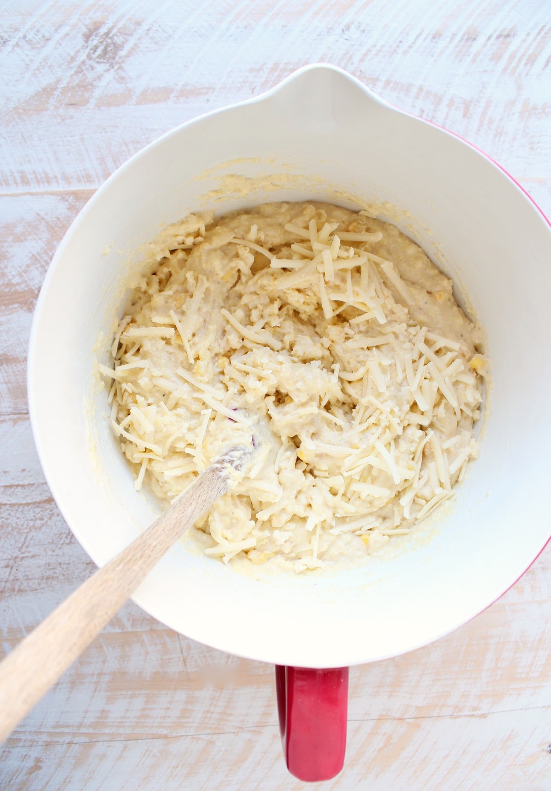 Add the wet ingredients to the dry ingredients. Mix well, then add the shredded cheddar and corn.