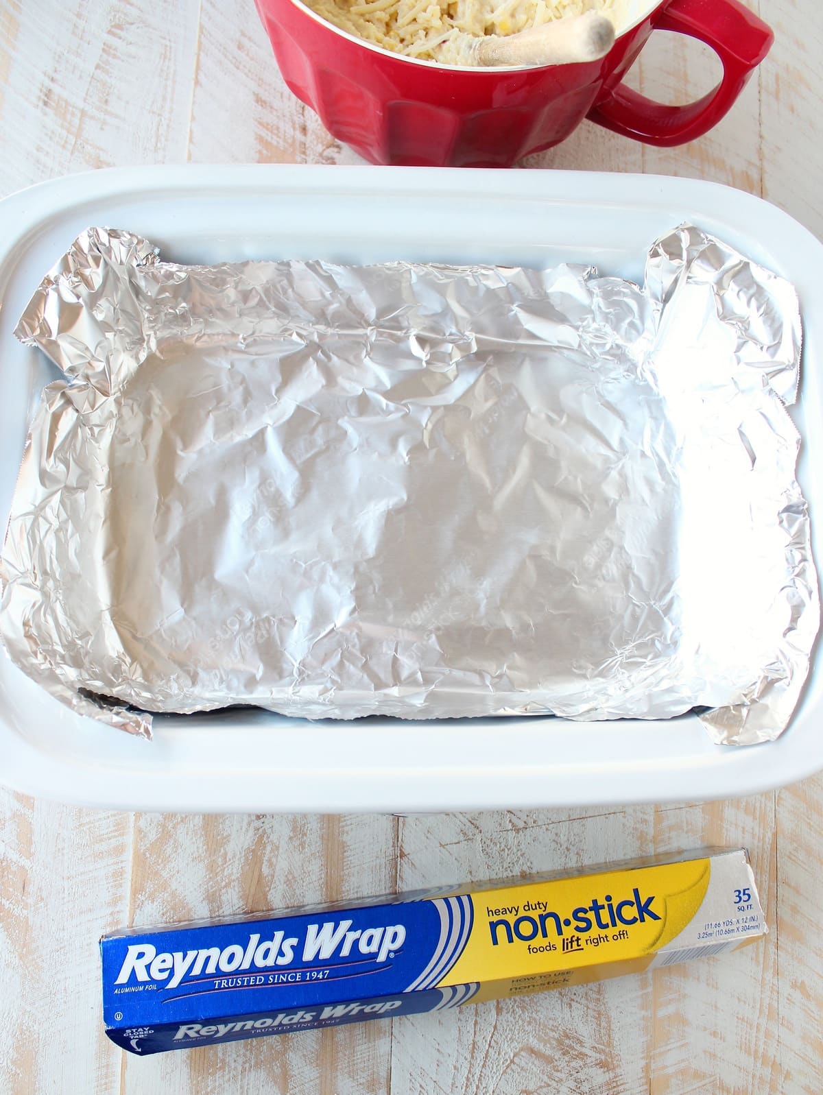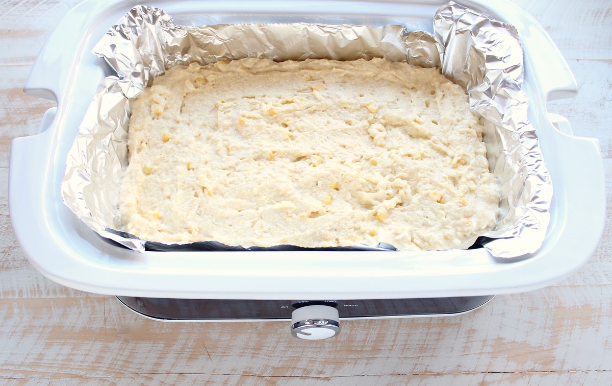For this recipe I used a 3.5 Quart Casserole Crock Pot, but a standard large oval crock pot would work also, just make sure to line the crock pot with non-stick foil all of the way to the top, so that you can easily use it to lift the cornbread out of the crock pot for serving.