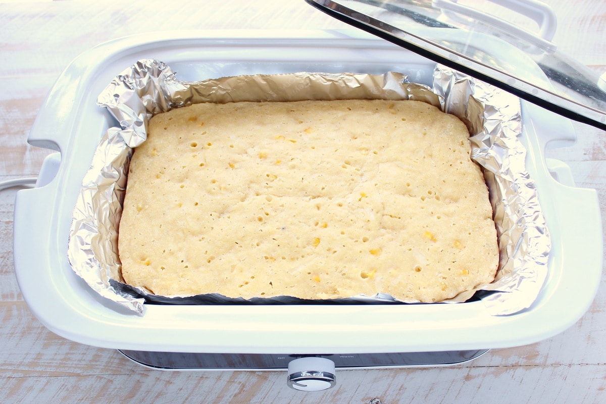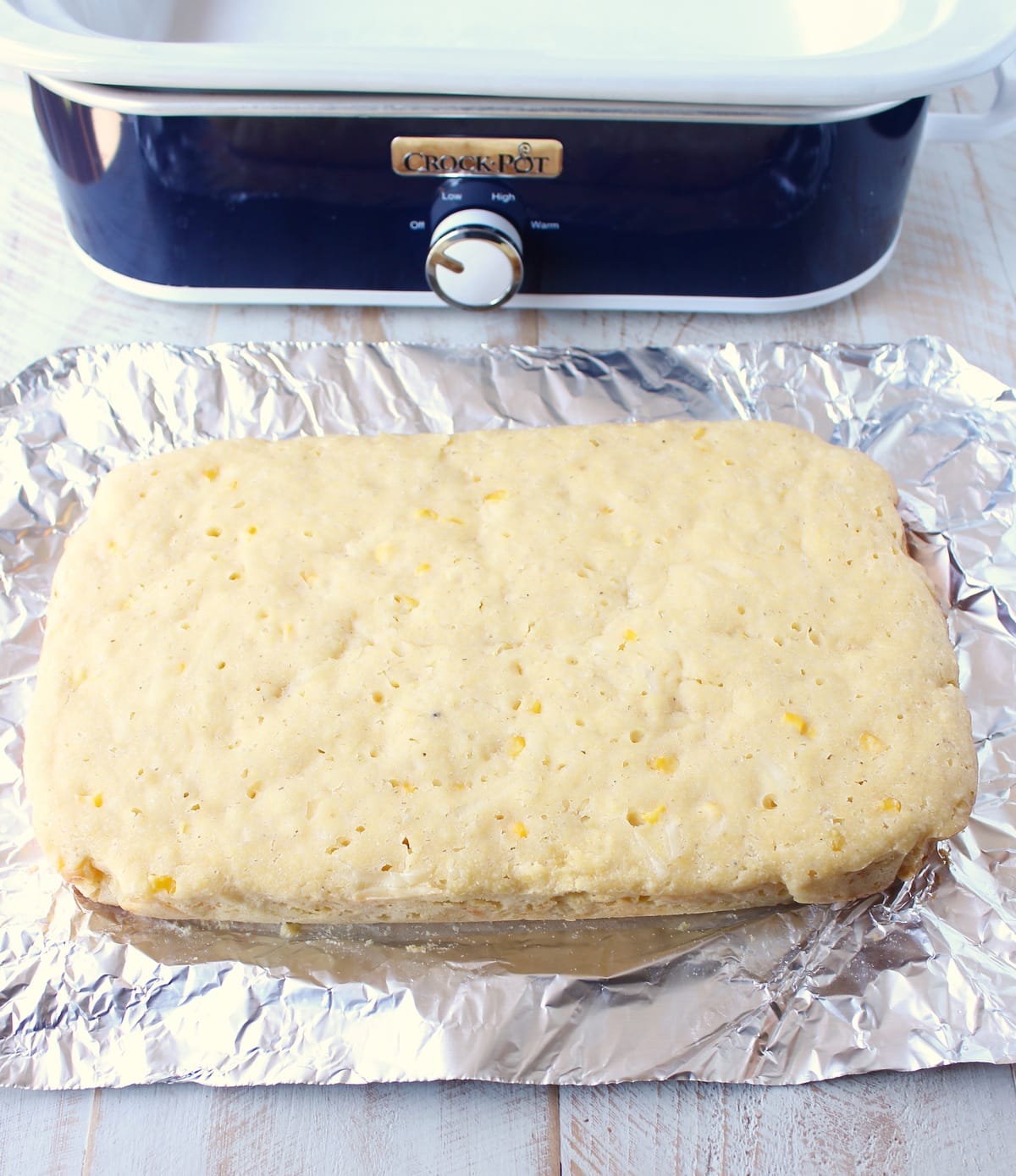 - Use the edges of the foil to lift and remove the cornbread from the slow cooker.