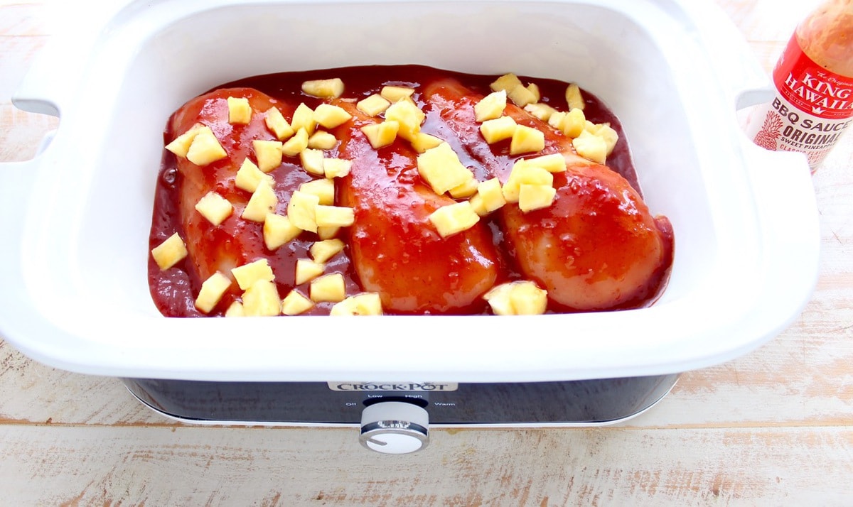 - Add the chicken, BBQ sauce and pineapple to a slow cooker.