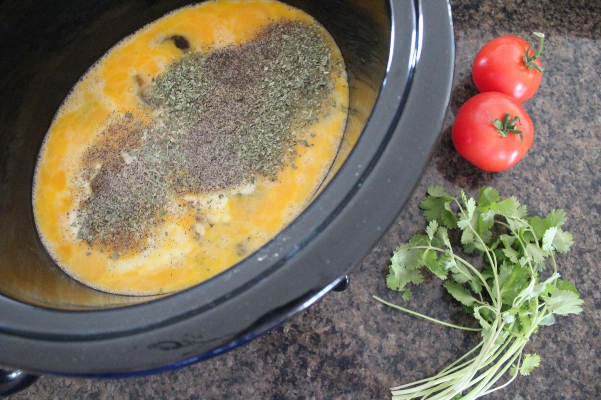 - Add the eggs, milk, salt, pepper and oregano to a slow cooker.
