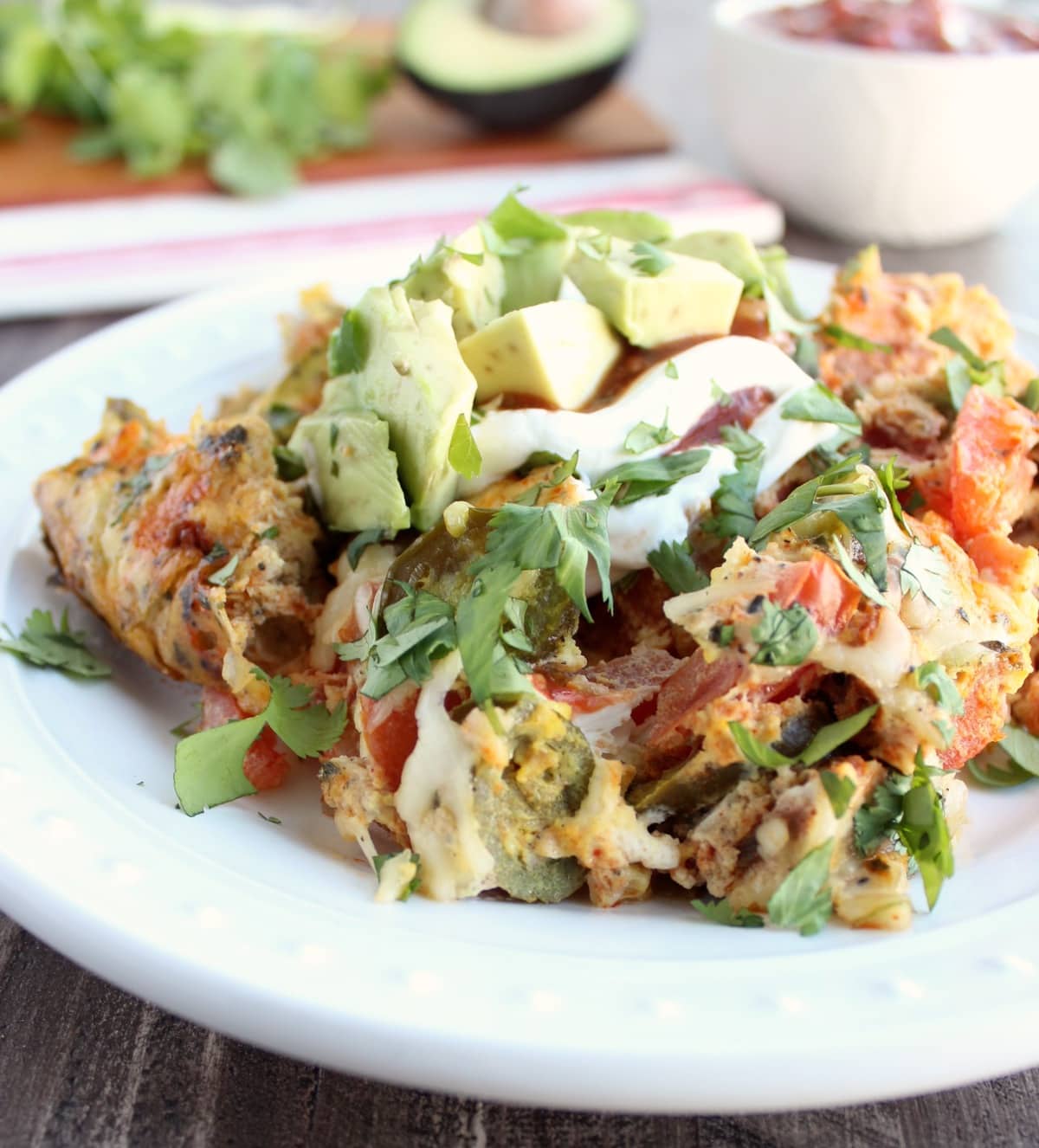 My boyfriend Kurt loves breakfast burritos, and who am I kidding, so do I, so a couple of mornings we heated up the Mexican Egg Casserole then wrapped it up in a tortilla with avocado, sour cream and hot sauce to make an epic breakfast burrito. It was seriously delicious!