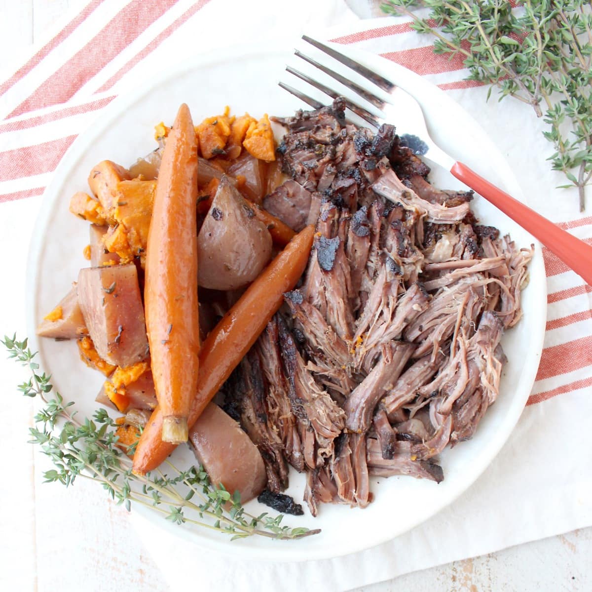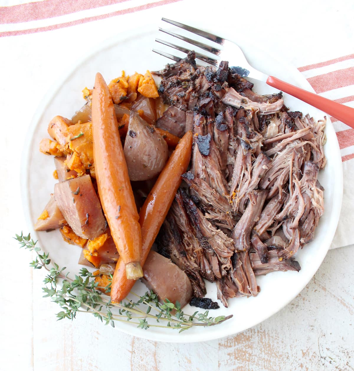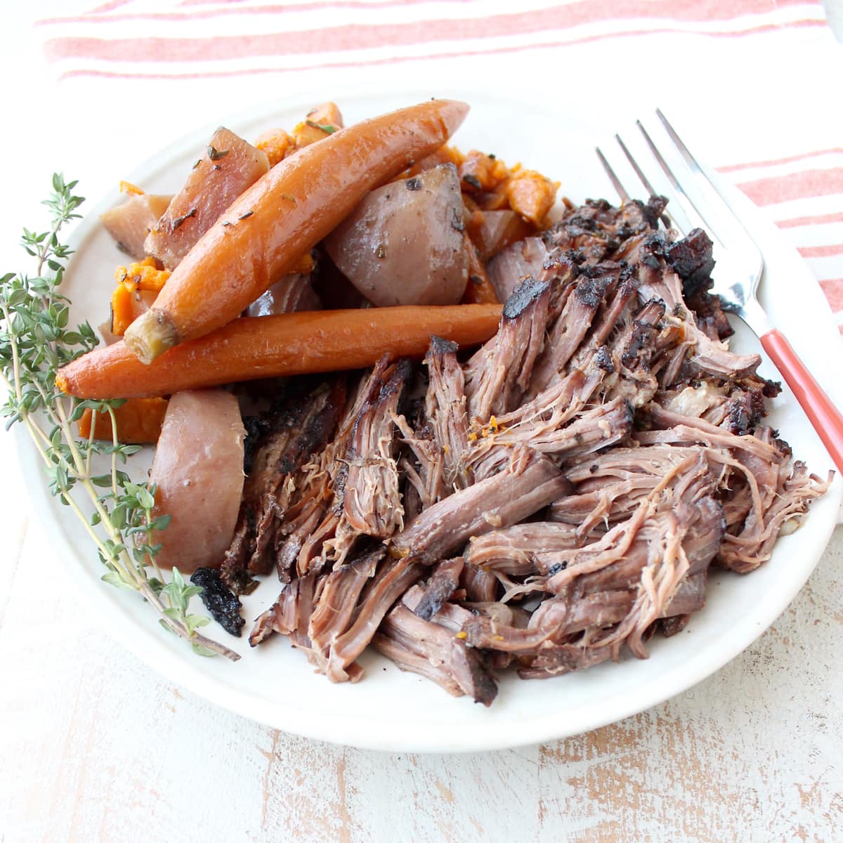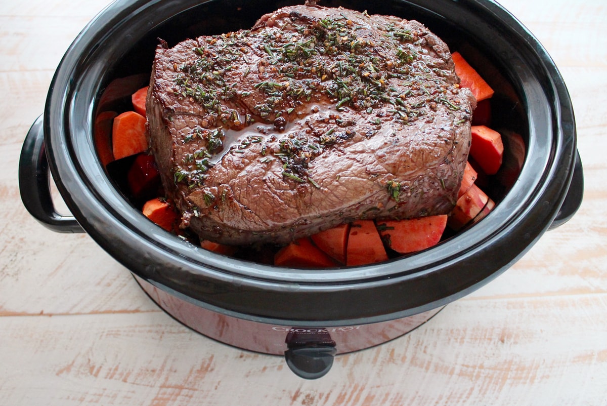 I made this slow cooker pot roast with potatoes, carrots and beets, but you can use whatever combination of vegetables you’d like.