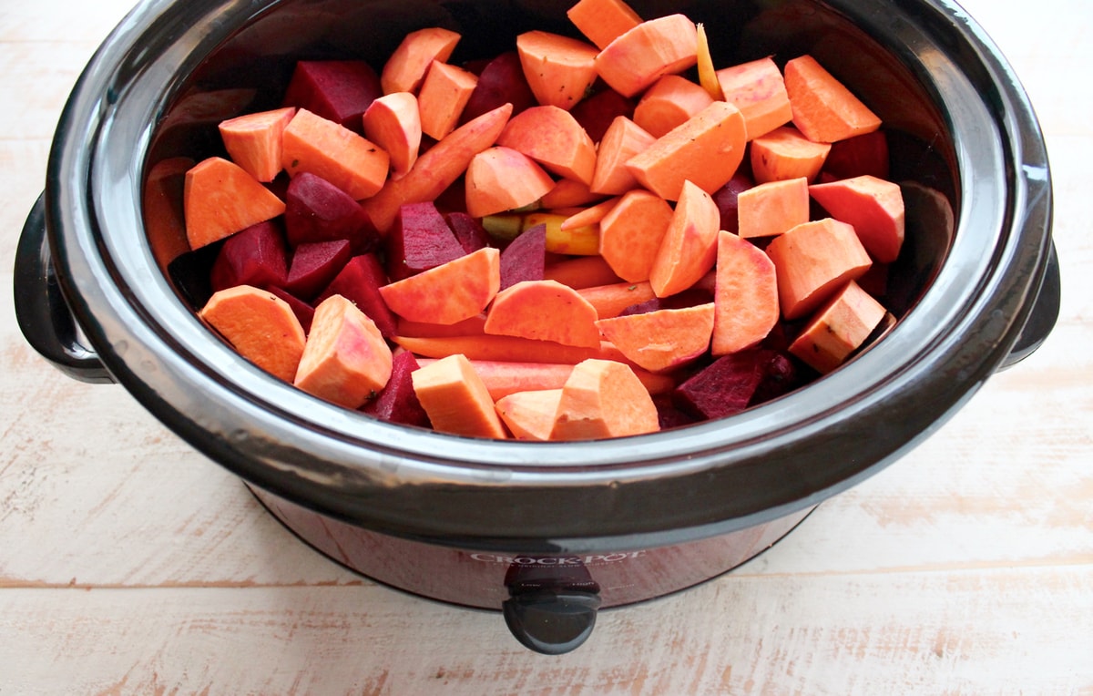Add the onion, sweet potatoes, carrots and beets to a large slow cooker.