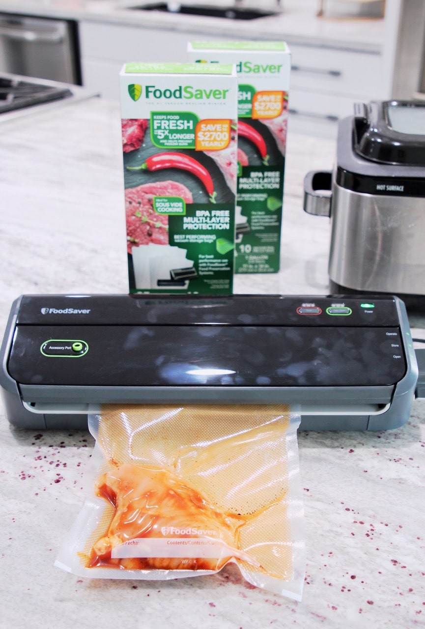 Sous vide chicken is so easy to make and creates the most juicy and tender chicken you’ll ever eat! Vacuum seal the chicken with BBQ sauce and toss it in the sous vide for 90 minutes to create a delicious meal!