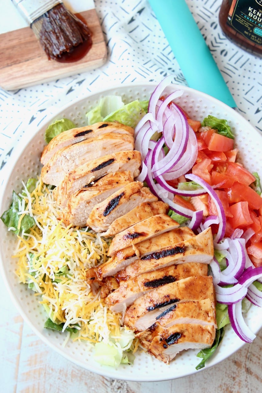 - BBQ Chicken Salad – add this BBQ chicken to the top of a salad tossed with ranch dressing and topped with tomatoes, onions and cheddar cheese.
