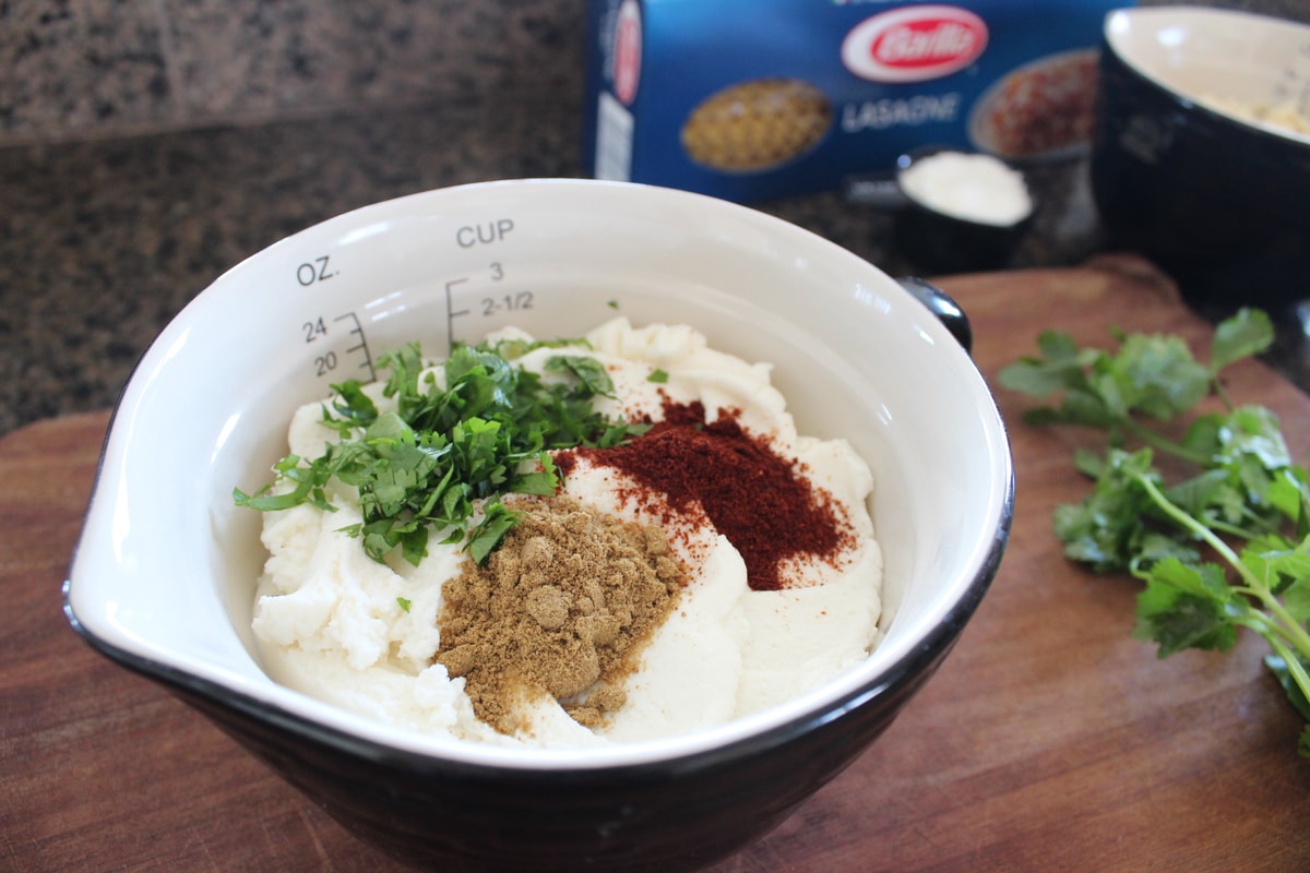 - In a small bowl combine the ricotta cheese, 1 tsp chili powder, 1 tsp cumin and cilantro.
