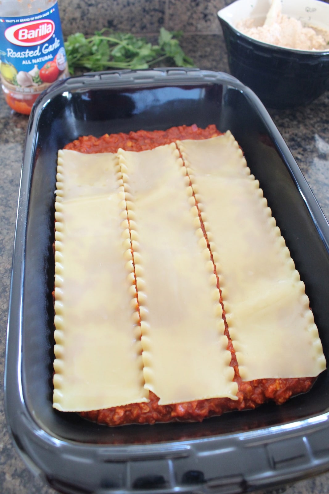 - Cover with the remaining sauce, then three lasagna noodles, then the remaining ricotta herb mixture.