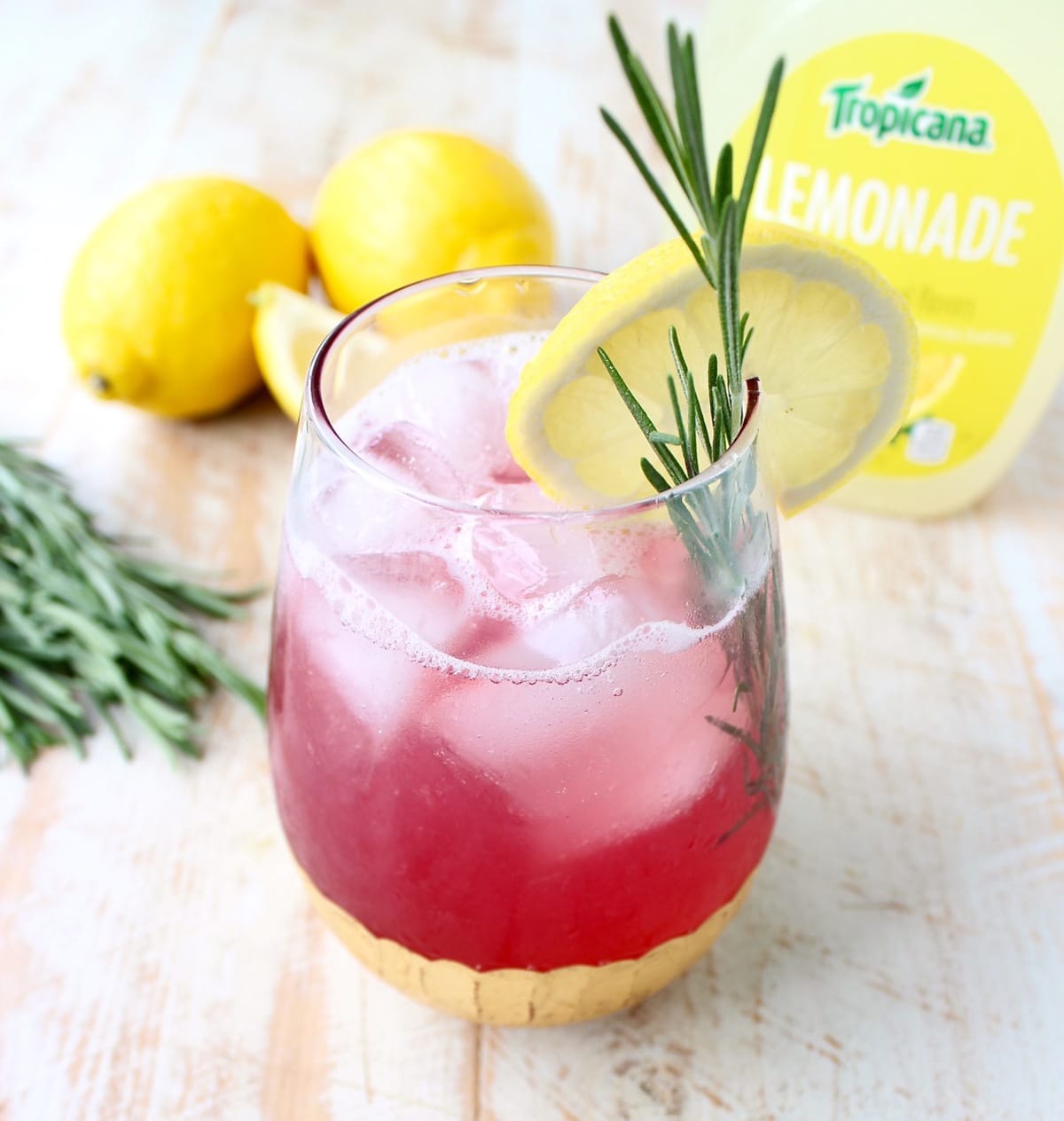I grabbed a bottle of Tropicana lemonade and made a super simple cocktail. Simple, but so delicious and definitely going in my happy hour regular rotation!