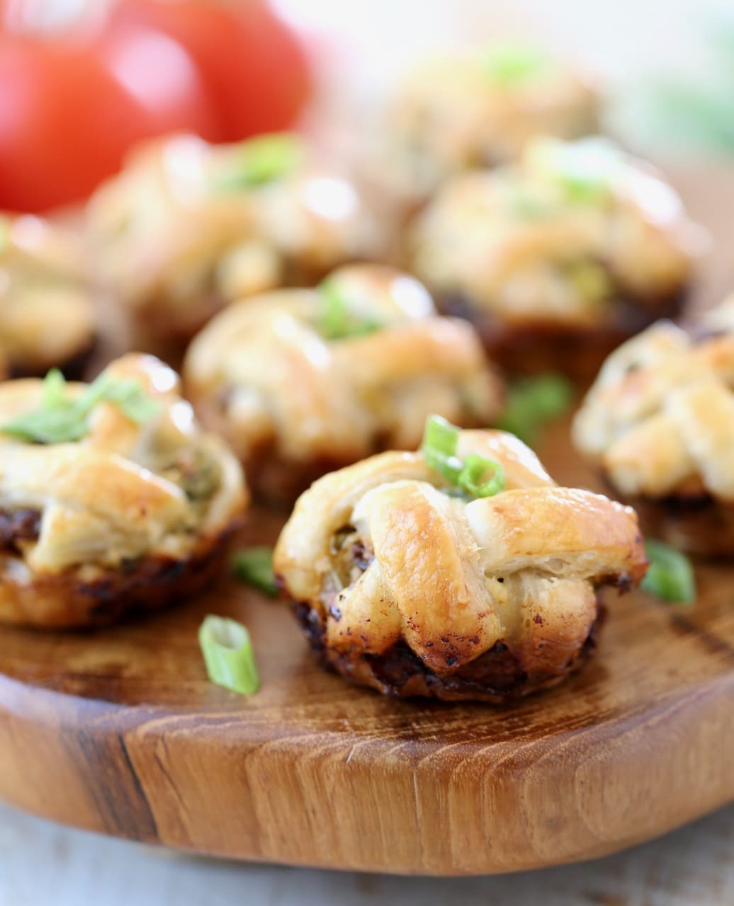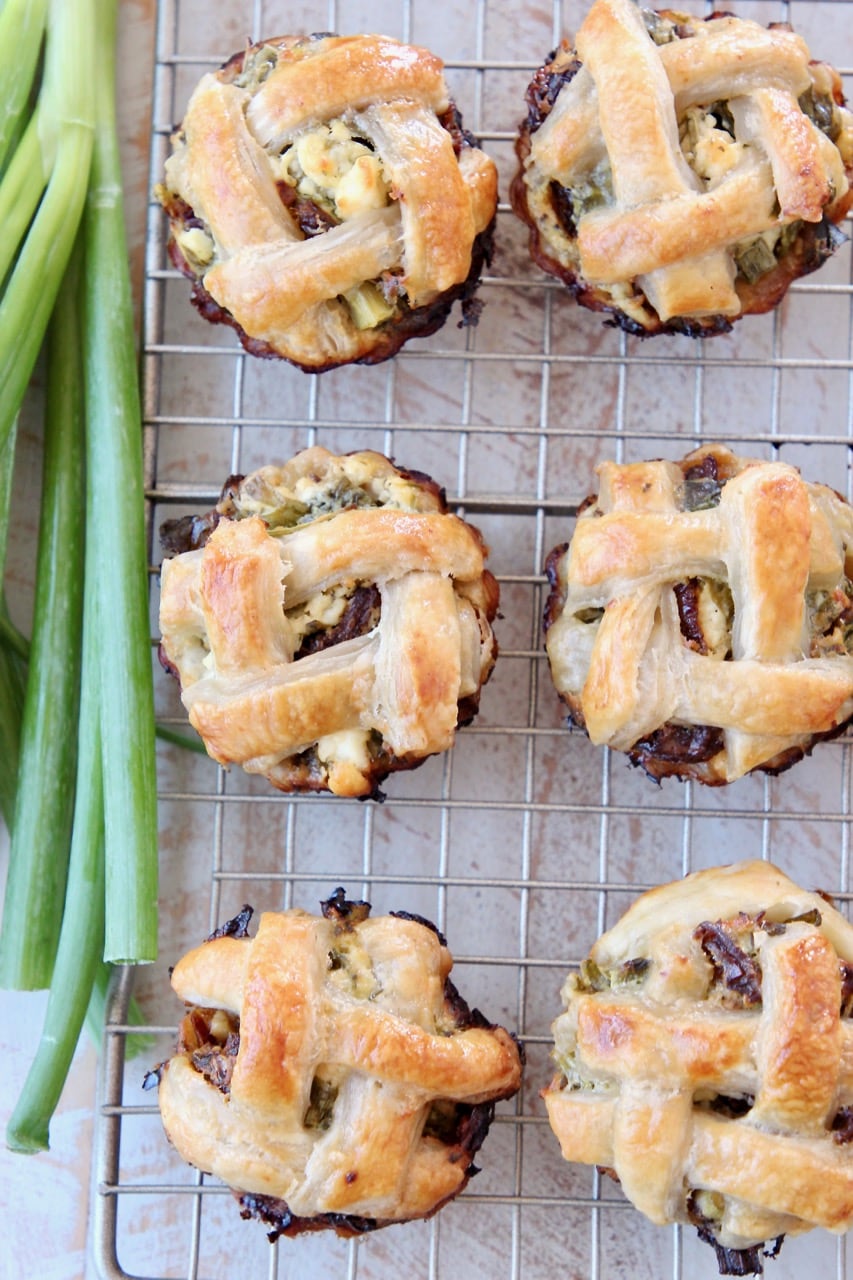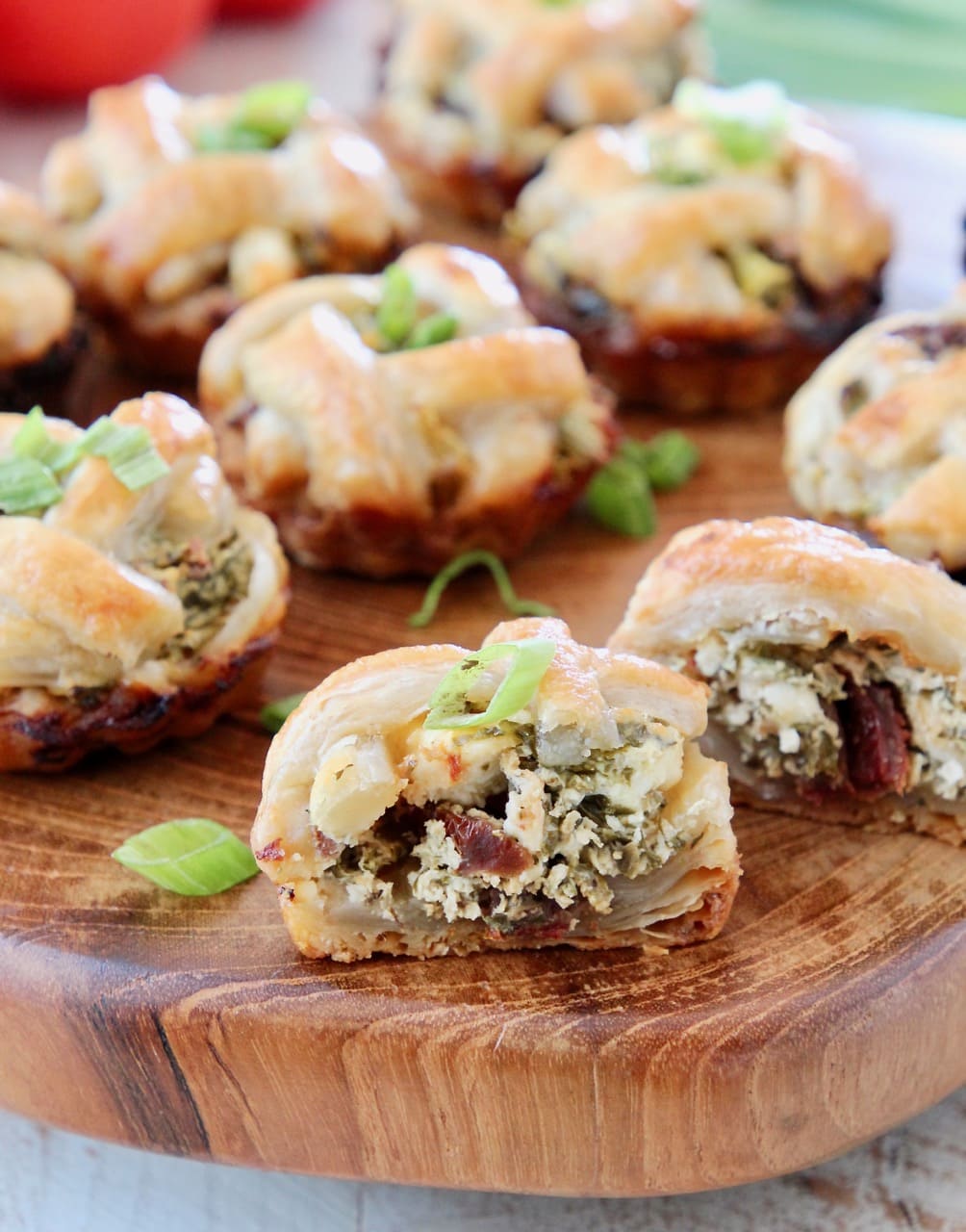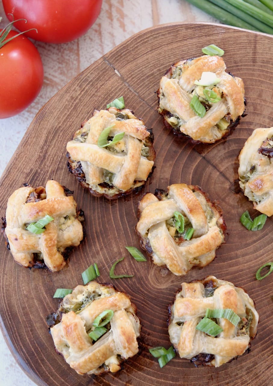 These mini pies are made with a puff pastry crust and filled with a combination of fresh spinach, feta cheese crumbles, sun dried tomatoes, garlic, herbs and greek yogurt.