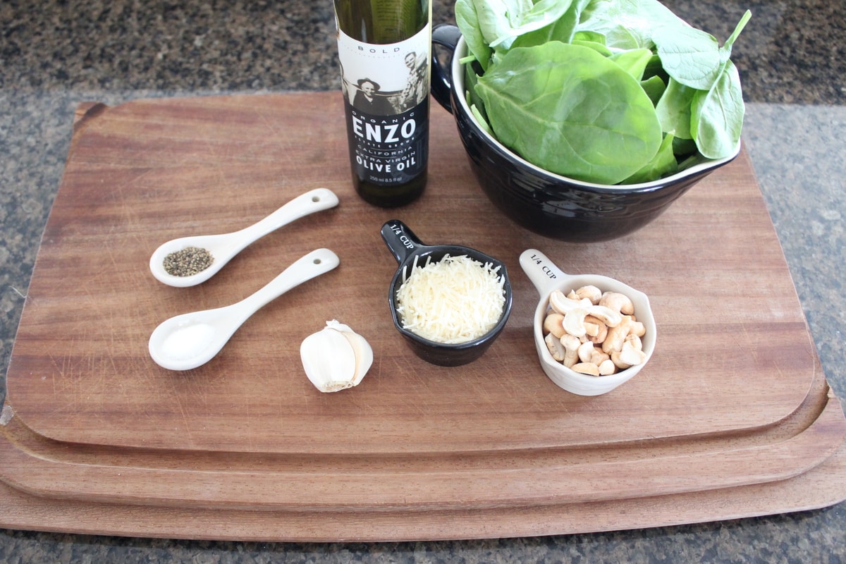 - Add the spinach, garlic and cashews to a blender or food processor.