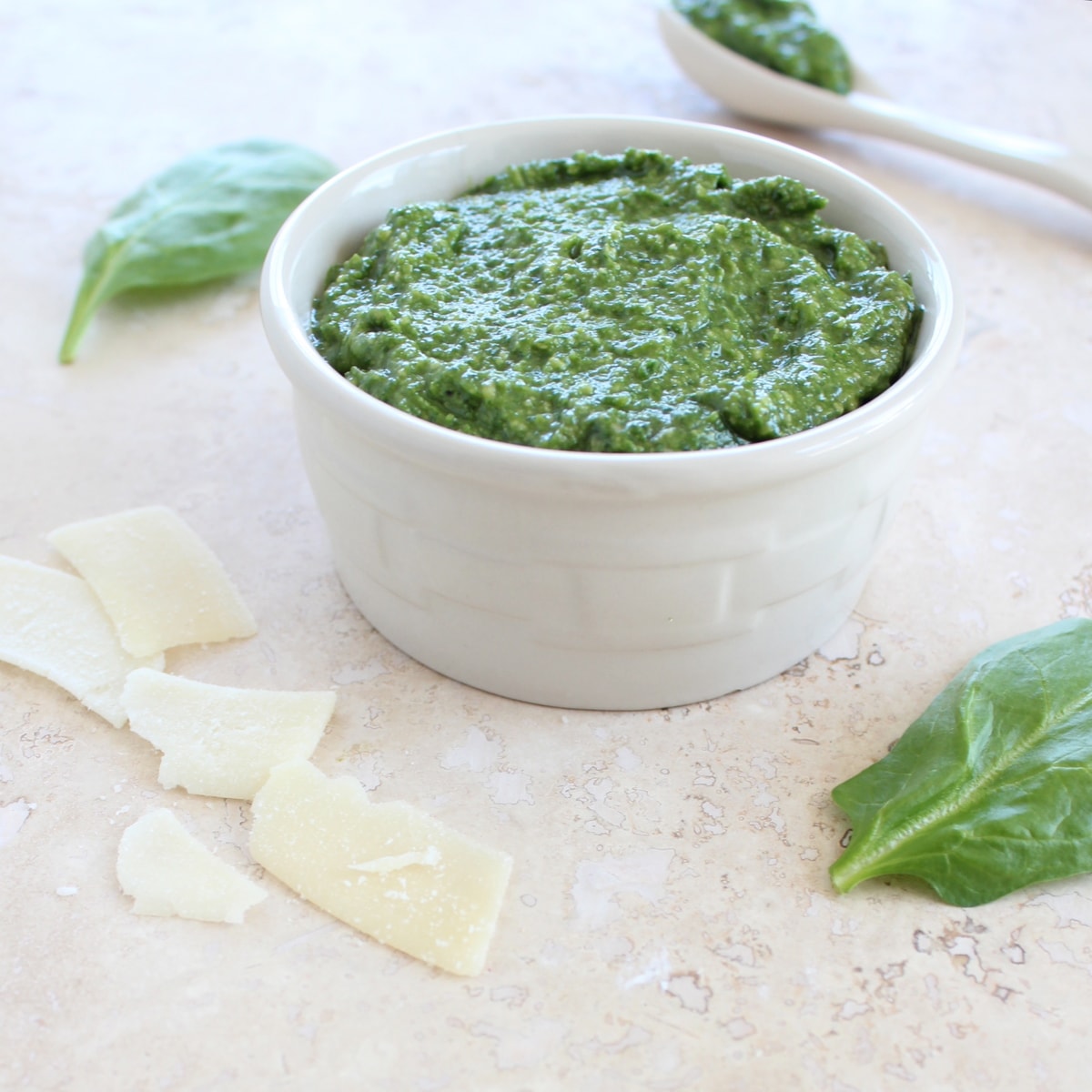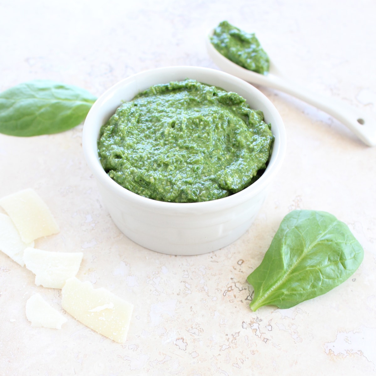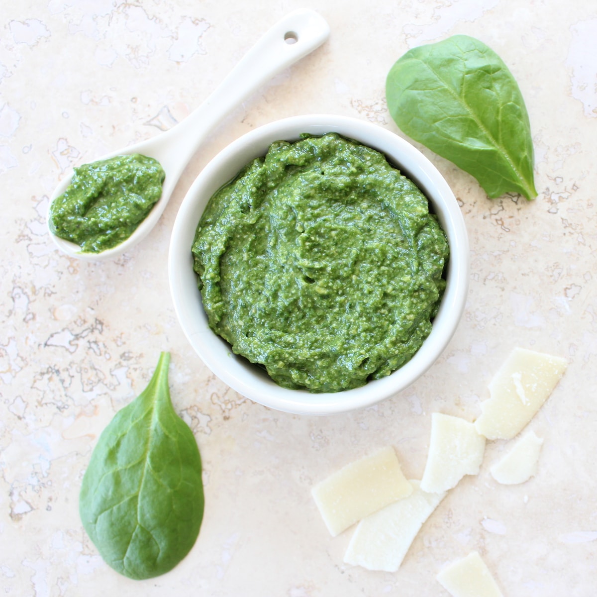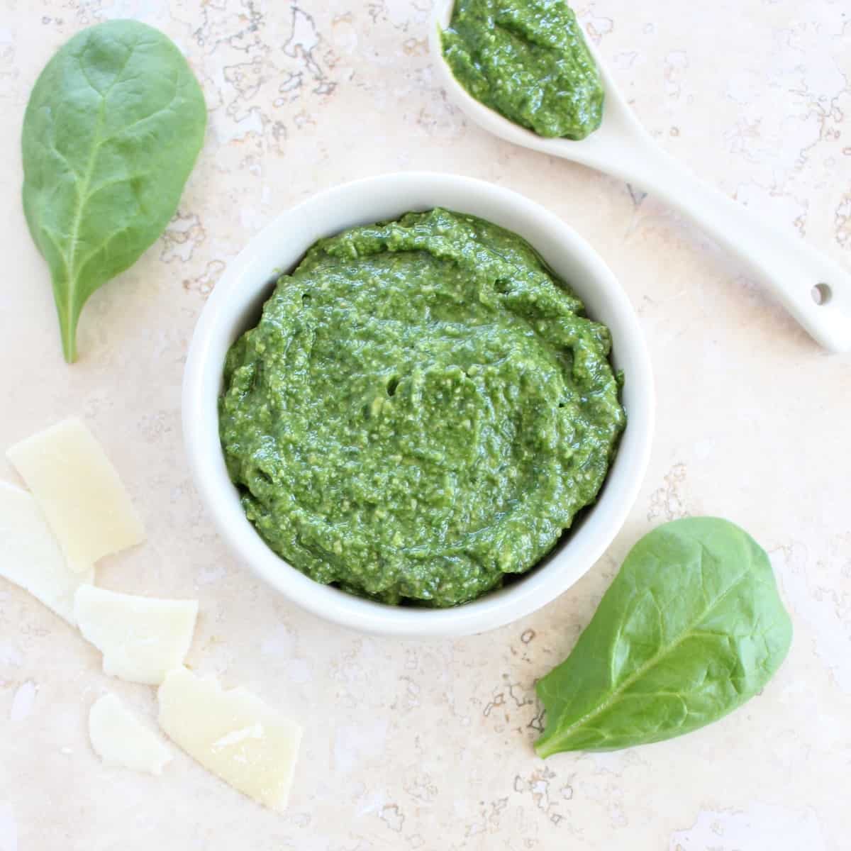 Homemade spinach pesto is a quick, easy, gluten free & healthy sauce made in just 5 minutes! Perfect for tossing on top of pizza, pasta, eggs or salad!