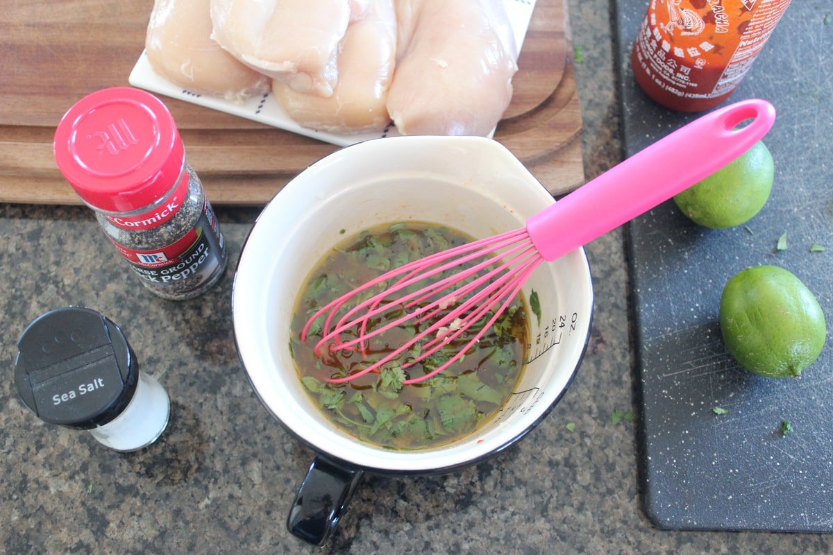 • Combine the olive oil, cilantro, lime juice, sriracha, garlic, salt and pepper in a small mixing bowl.