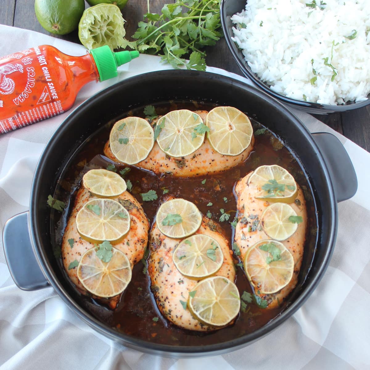 This Sriracha Lime Chicken recipe is as easy as it is delicious! A simple sriracha lime marinade is poured over chicken, then baked for a healthy meal.