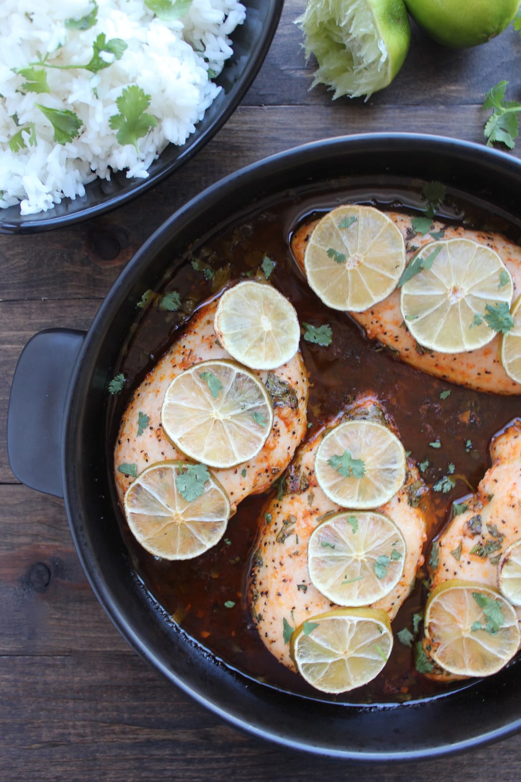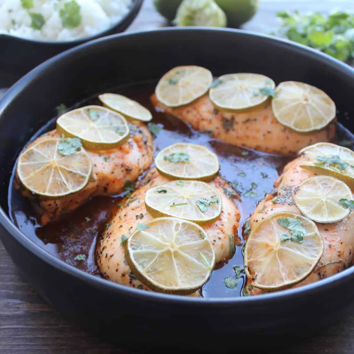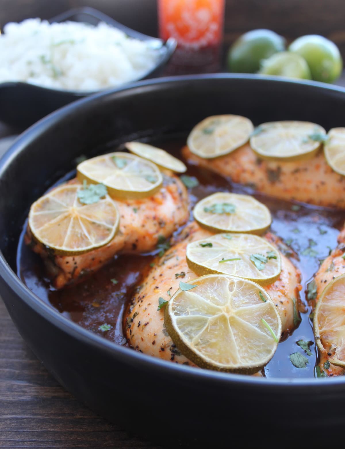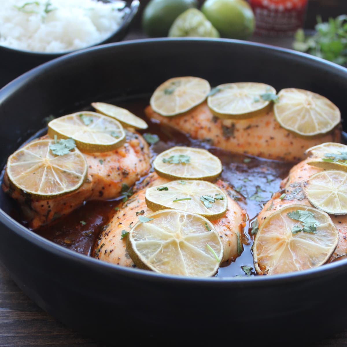 • Thinly slice the additional limes and place on top of each piece of chicken.