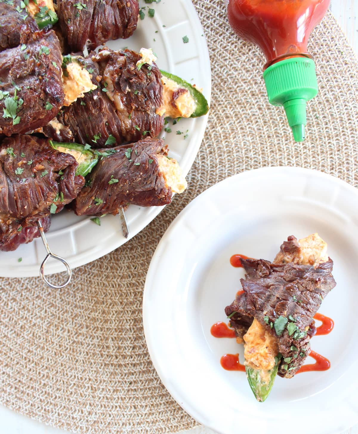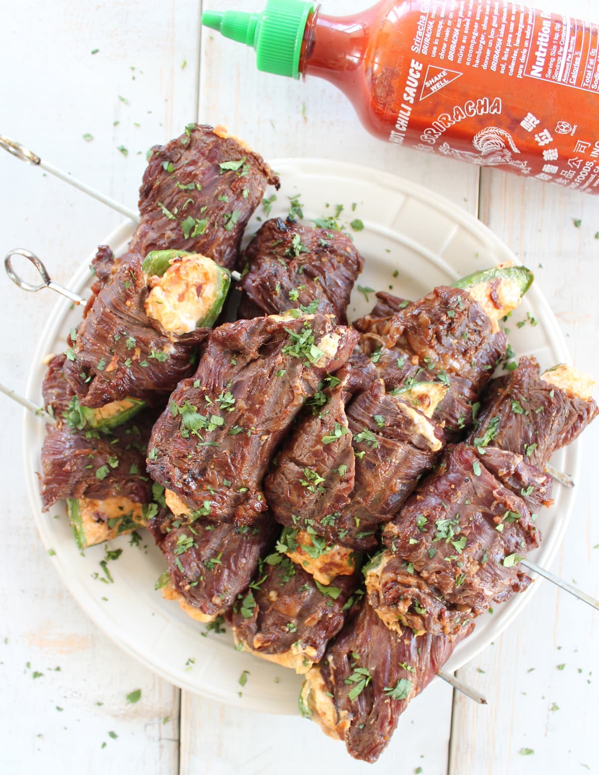 Jalapeño Poppers are filled with cheese and bacon, then wrapped in sriracha marinated steak and grilled on skewers for the ultimate meaty, cheesy meal!