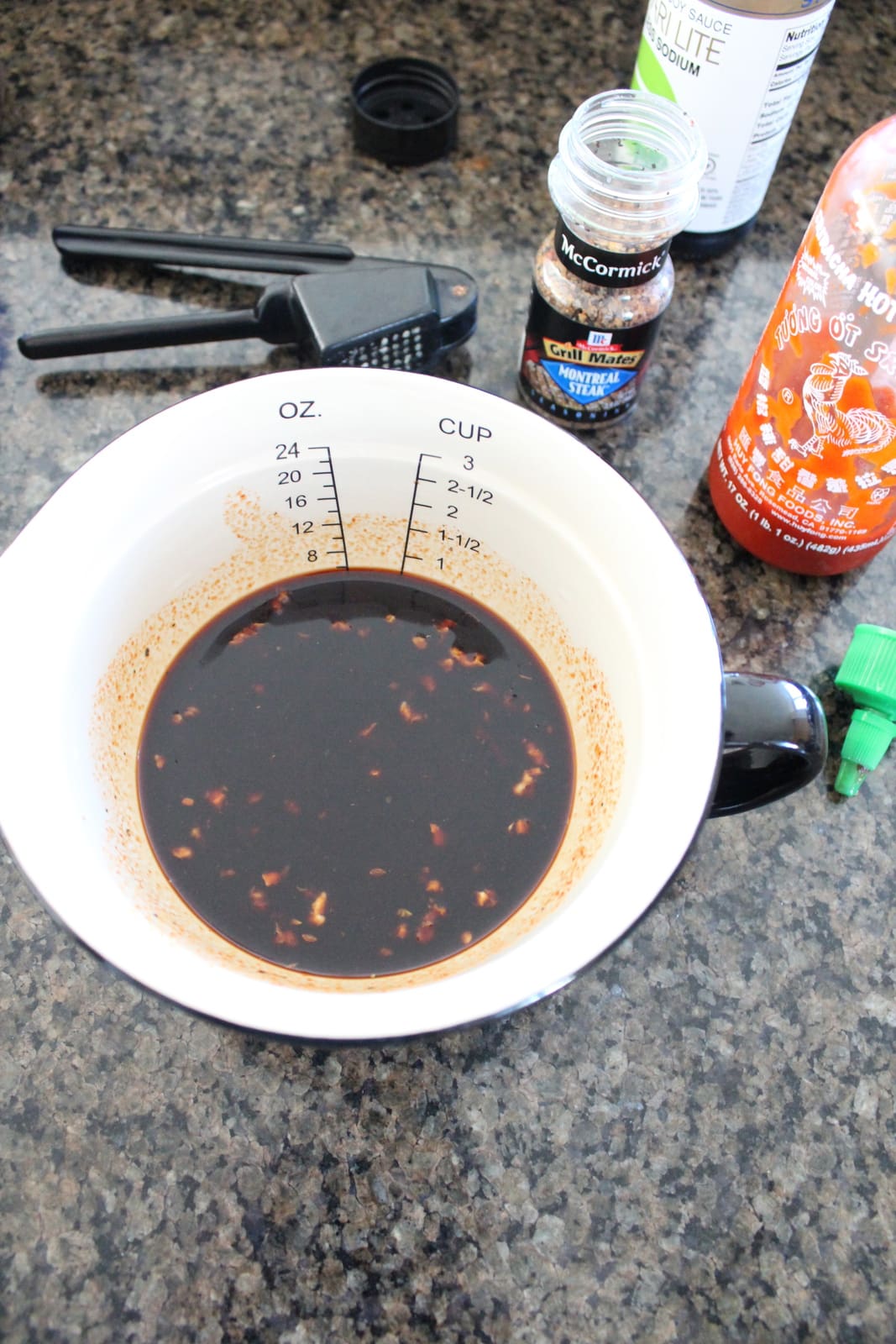 • Combine 2 tbsp sriracha, soy sauce, garlic and steak seasoning in a medium bowl.