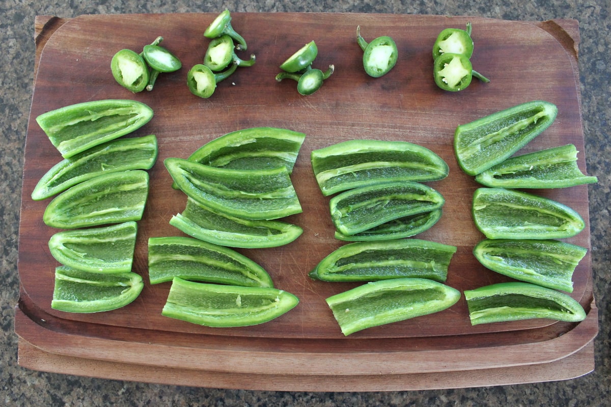 • Slice the jalapenos in half lengthwise and remove the seeds and membranes.