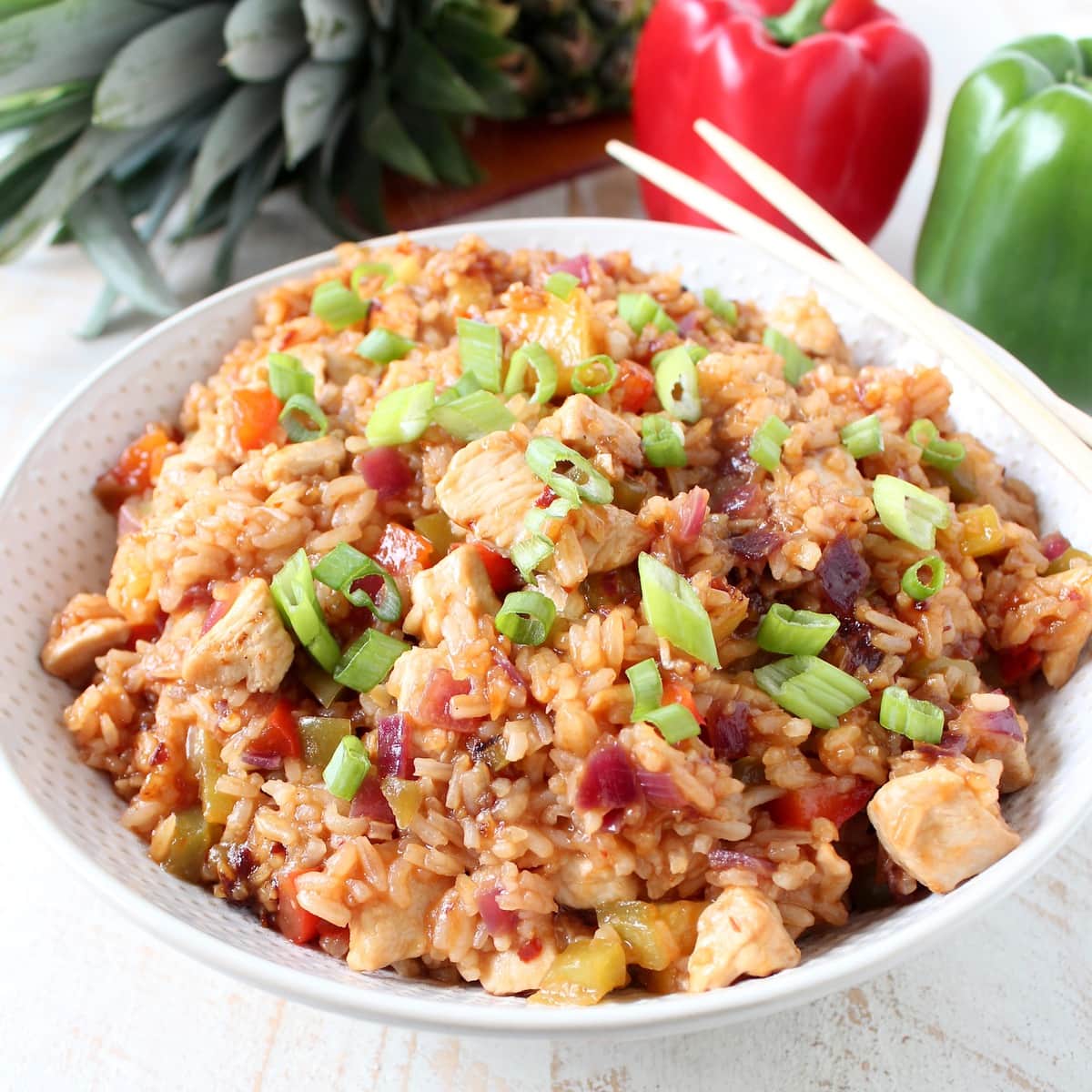 With a new smaller kitchen, I’m trying to keep the dishes to a minimum. This means more One Pot Dishes than ever coming your way, starting with this scrumptious One Pot Sweet & Sour Chicken Fried Rice!