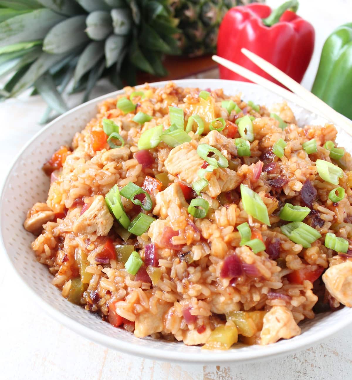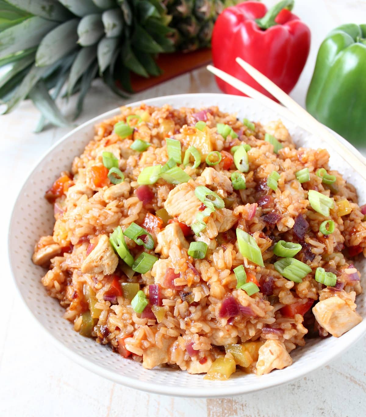 Two delicious Chinese recipes come together in this easy One Pot Sweet and Sour Chicken Fried Rice Recipe that’s made in only 20 minutes!