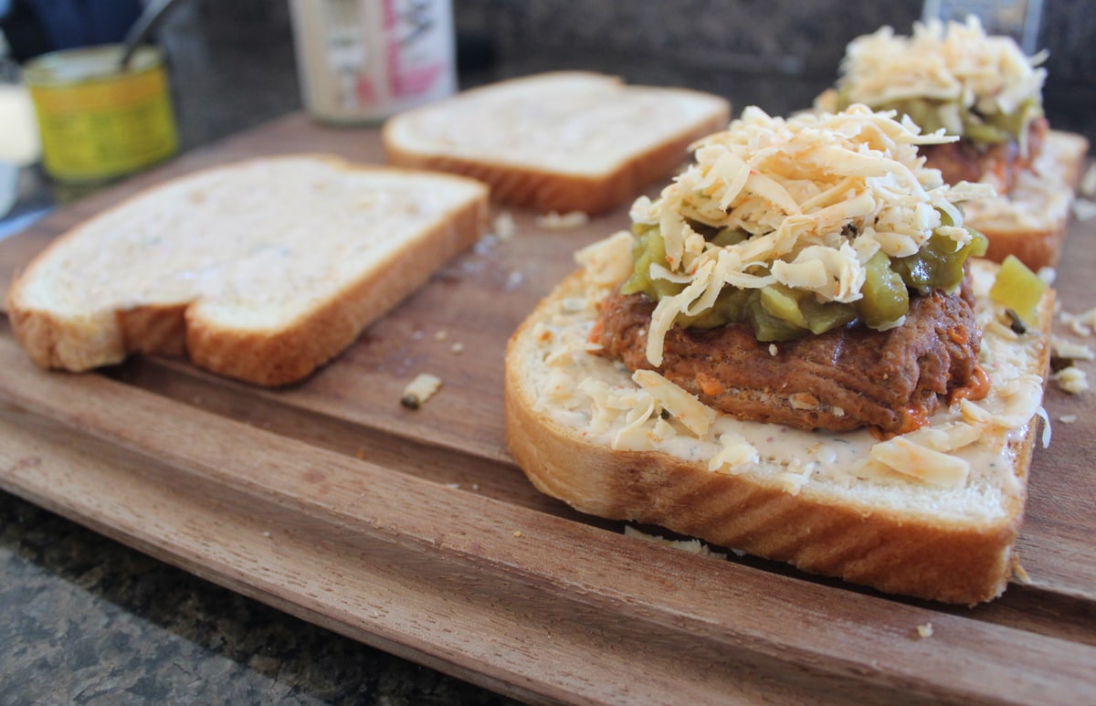 - Add a burger patty on top of the dressing on half of the slices of bread, top each with 2 tbsp green chilies and ½ cup of cheese.