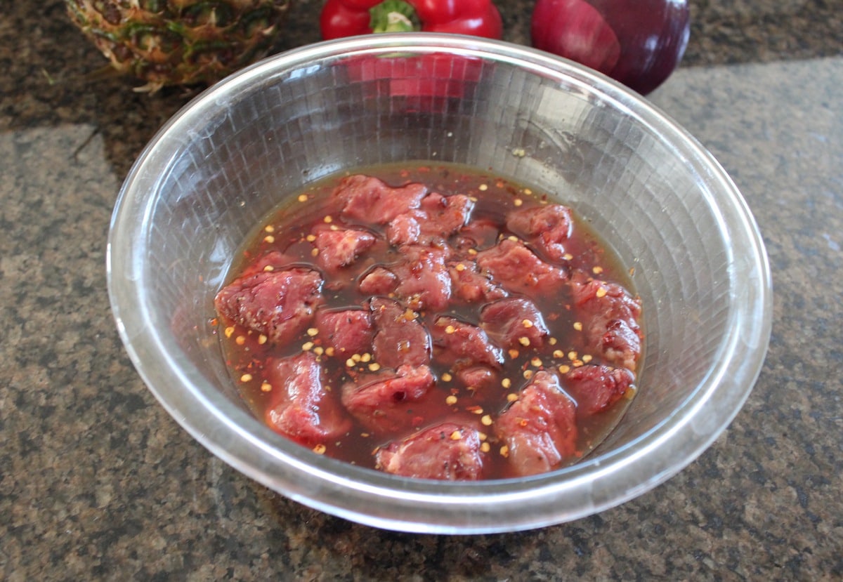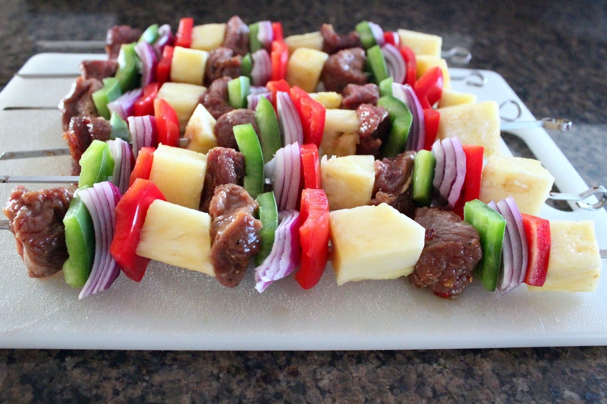 - Remove the steak from the marinade and skewer with the bell peppers, onion and pineapple.