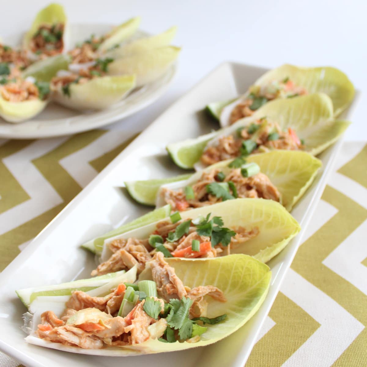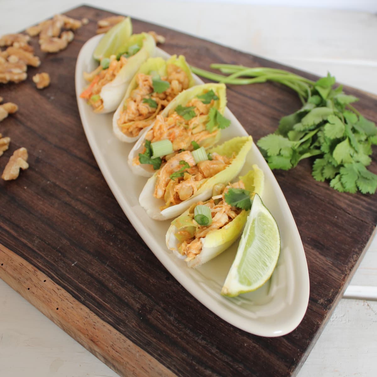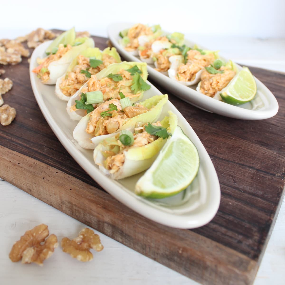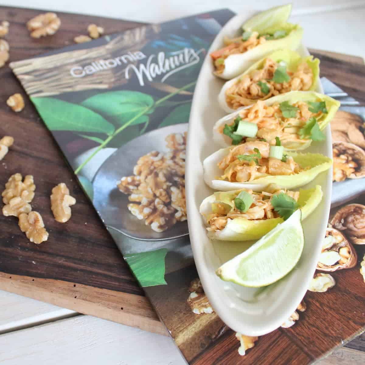 Thai Chicken Salad combines shredded chicken, carrots, cabbage, walnuts & Thai Peanut Sauce, placed on endive spears, they are the perfect party appetizer!