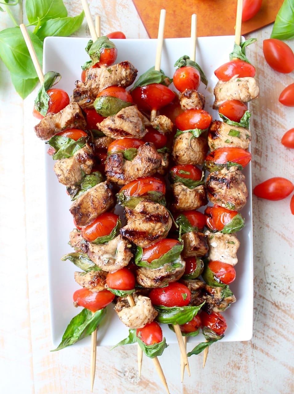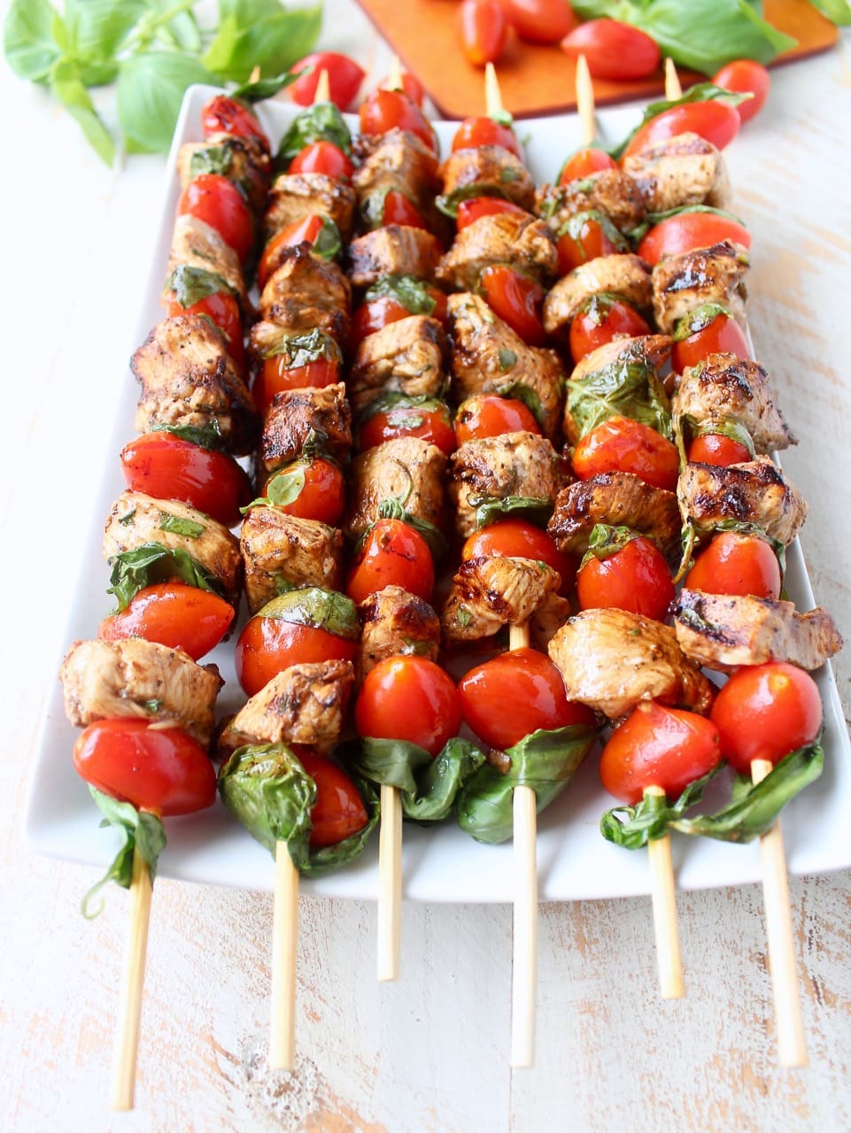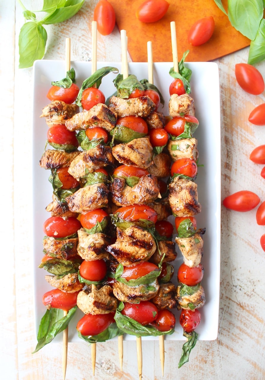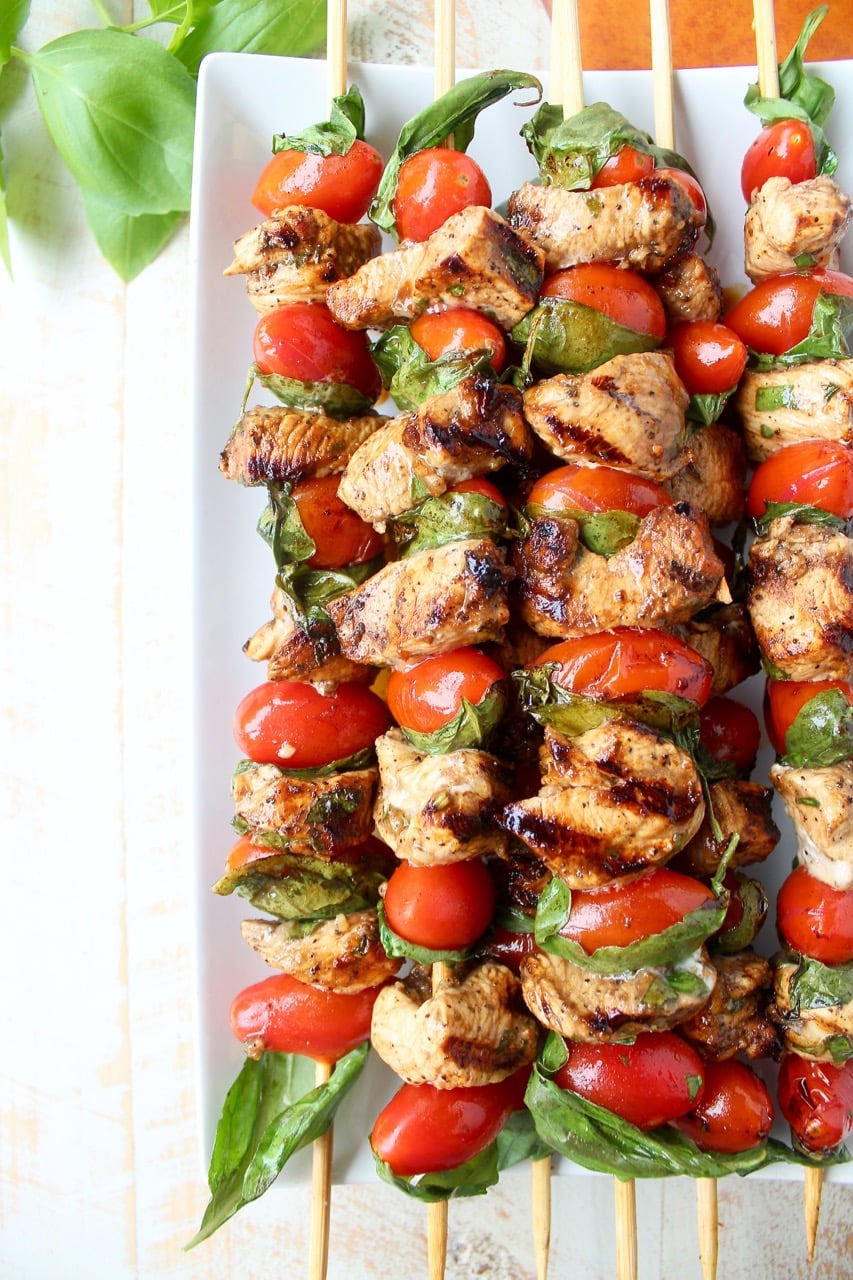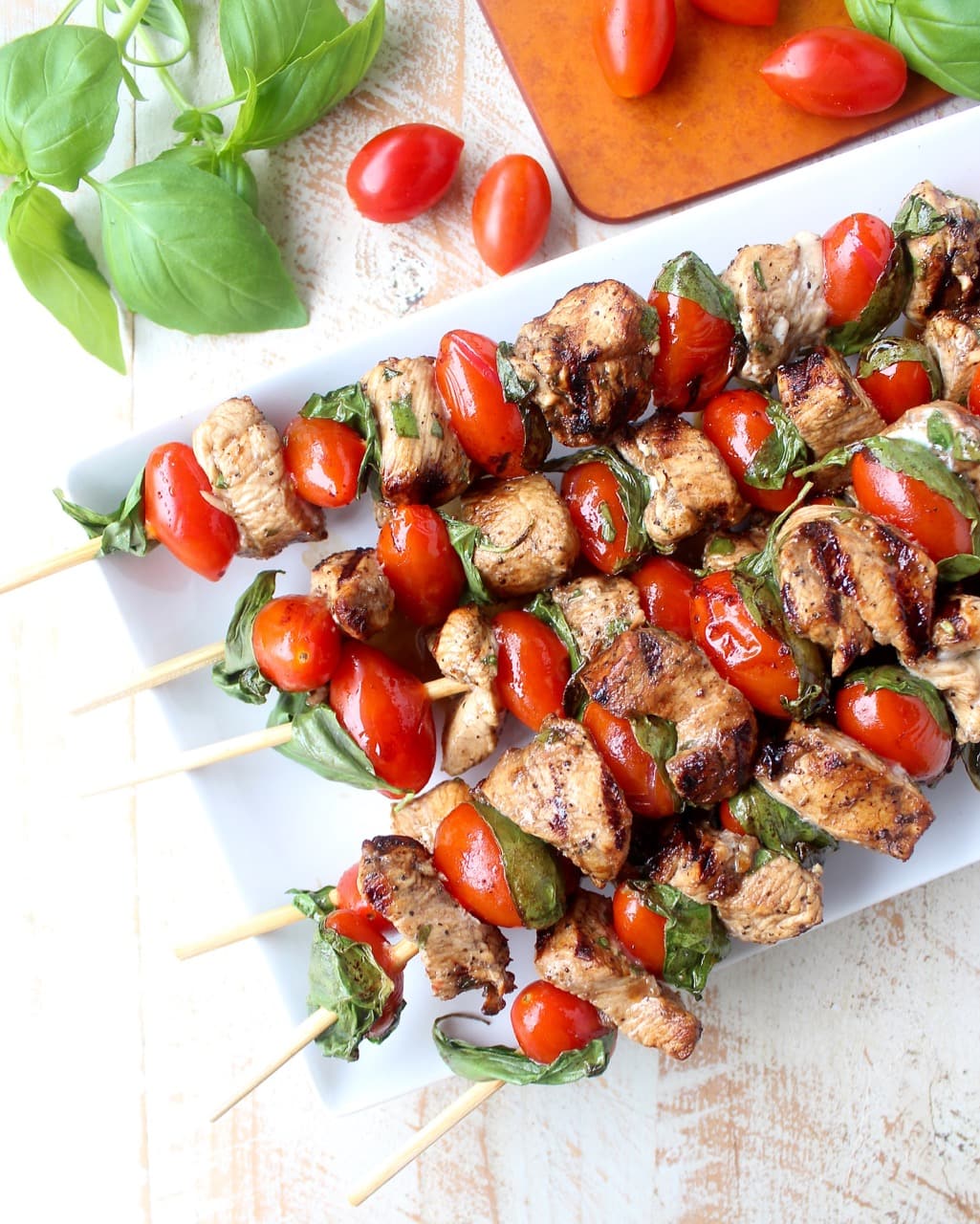 The easiest & most delicious Tomato Basil Chicken Skewers are made with marinated chicken, cherry tomatoes & fresh basil for a healthy, gluten free meal, made on the grill!