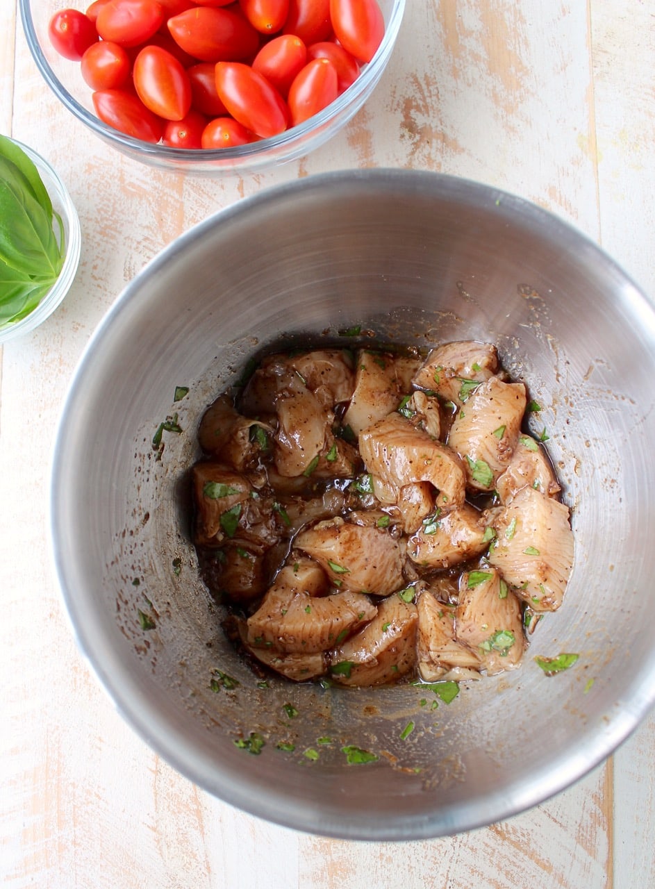 Combine the olive oil, balsamic vinegar, salt, pepper, garlic and 2 tbsp chopped basil in a medium bowl. Add the chicken and marinate for 10-15 minutes.