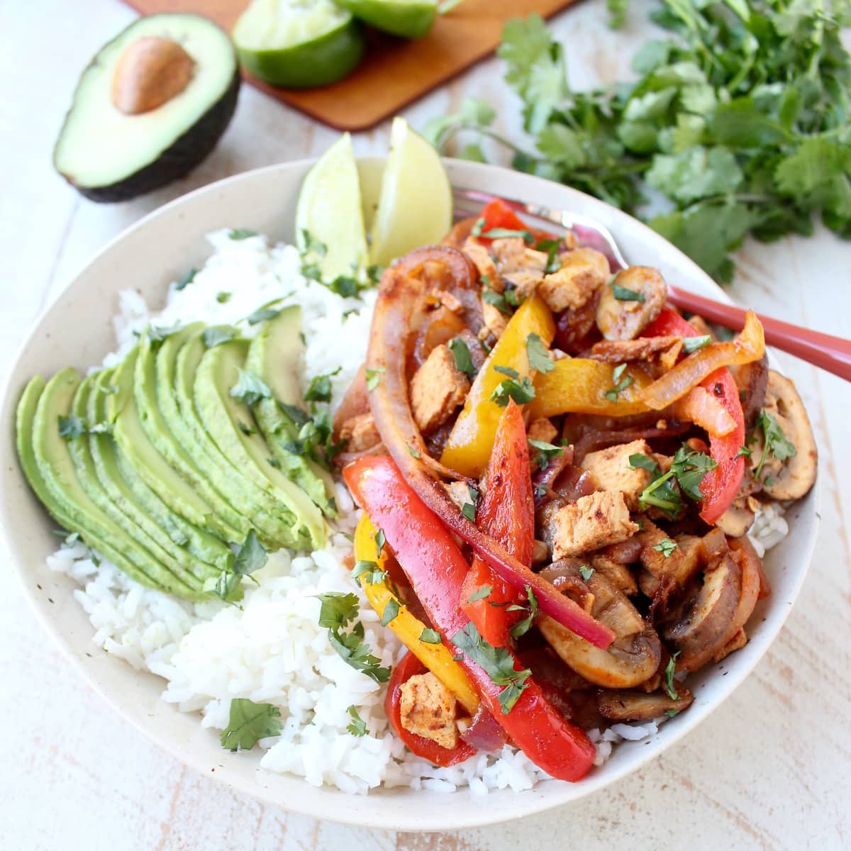 - Divide the rice between two bowls, top with the vegetable and turkey fajita and sliced avocado.