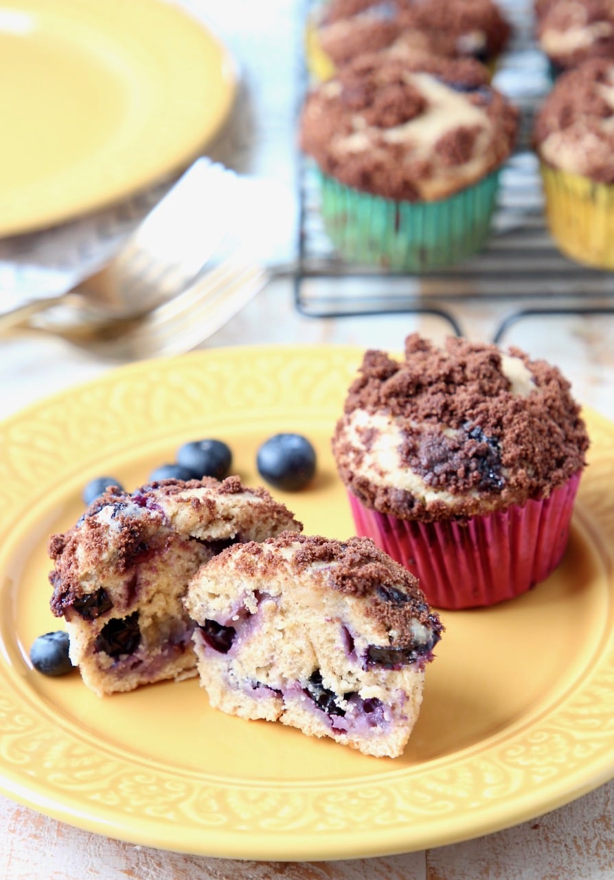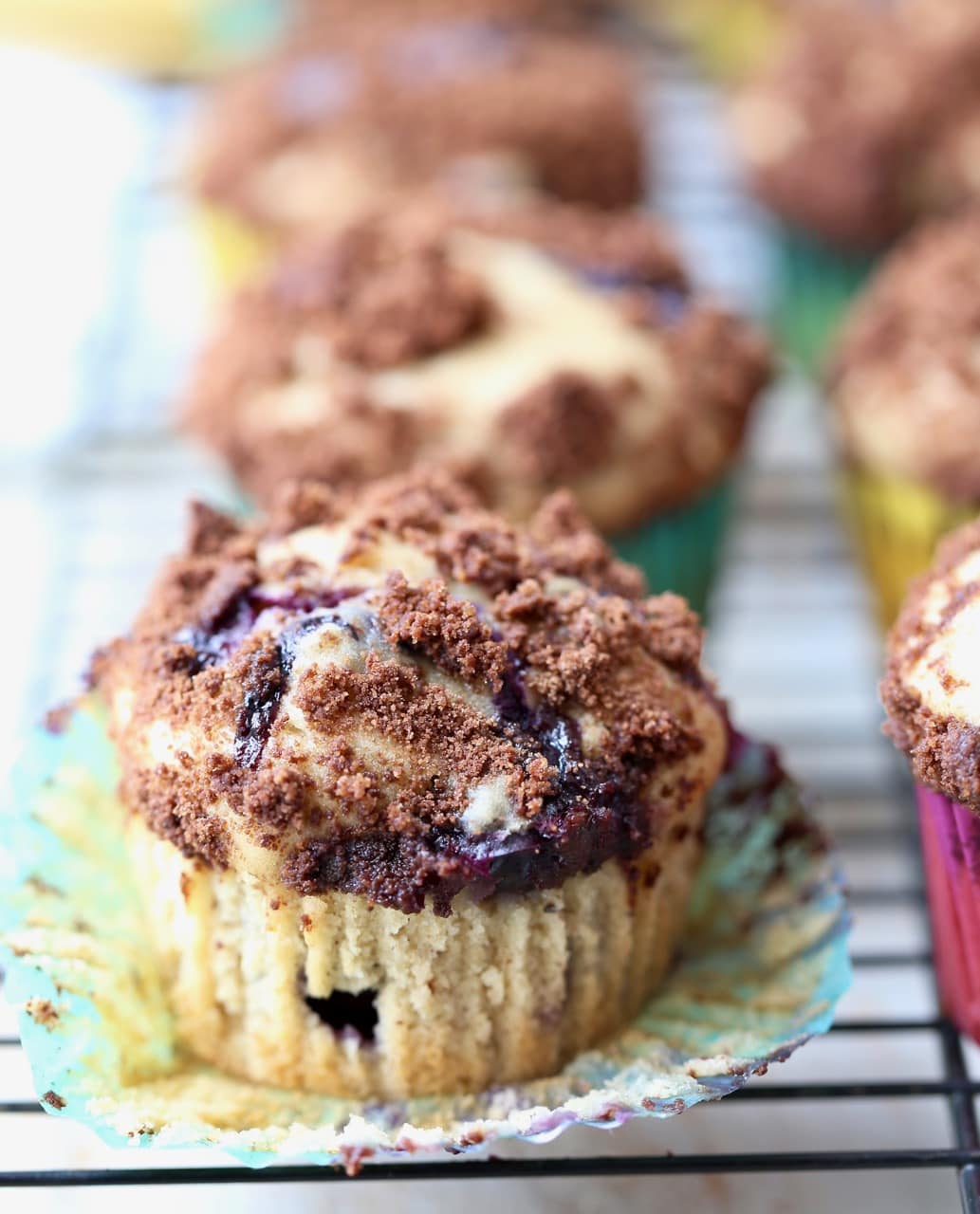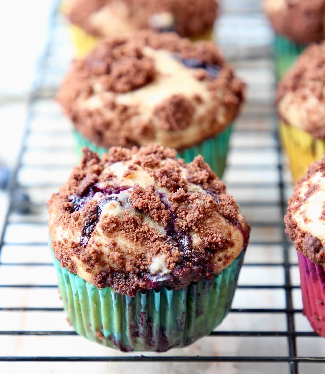 Fresh blueberries and luscious cream cheese are combined in these delicious blueberry cream cheese muffins, topped with a scrumptious chocolate crumble!