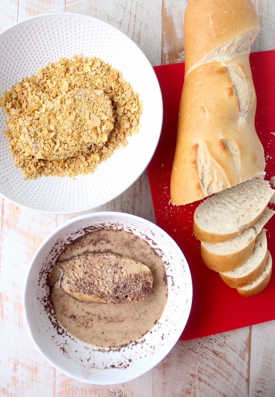 - Transfer the soaked bread to the bowl of crushed cornflakes and cover each side of the bread.
