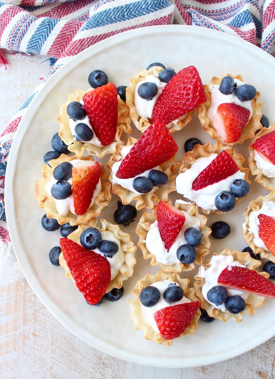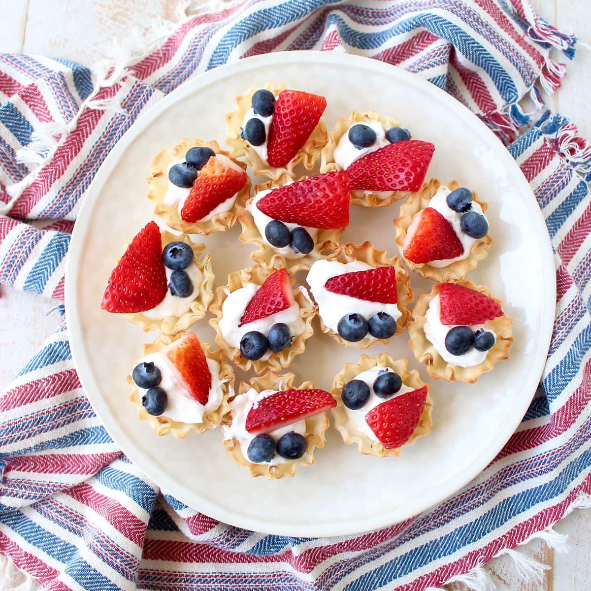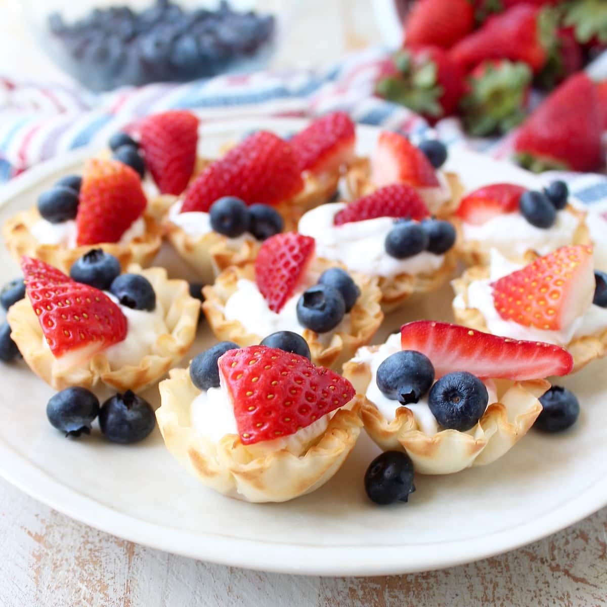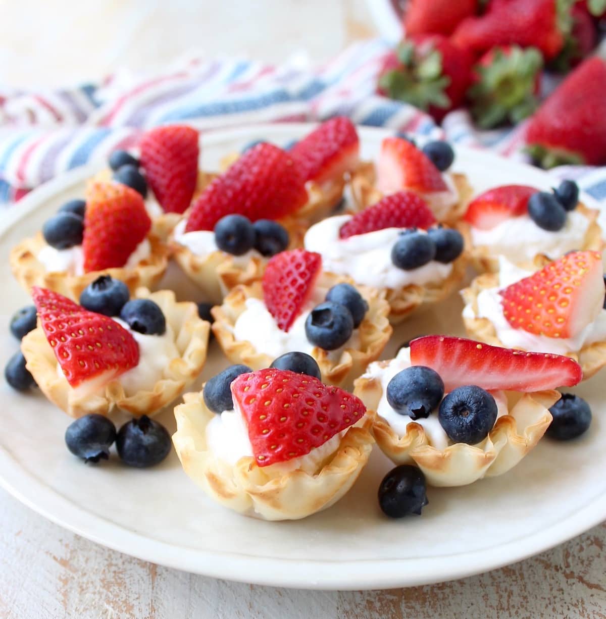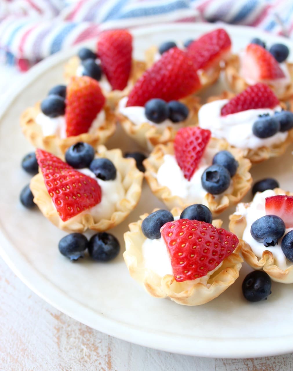 These berry cream fillo baskets are the perfect bite-sized patriotic dessert for a summer cook-out! I’m a fan of the popular “flag cake”, but after a huge plate of BBQ I thought something small and light would be better!