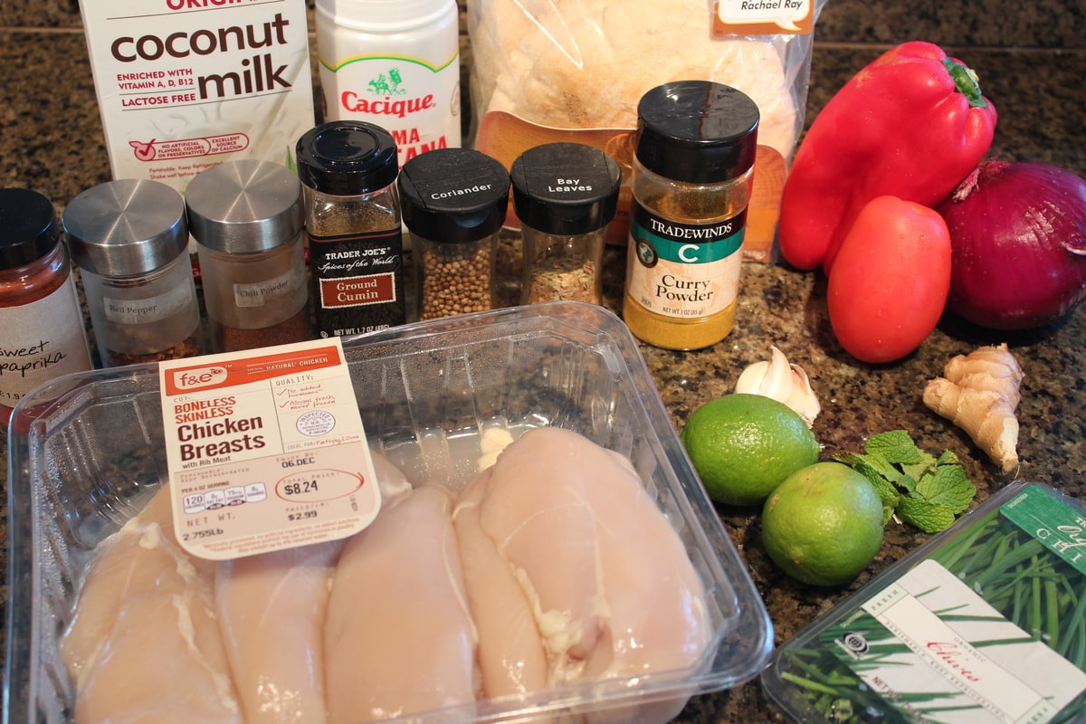 chicken, curry powder, red bell peppers, red onion, garlic, ginger, limes, chives