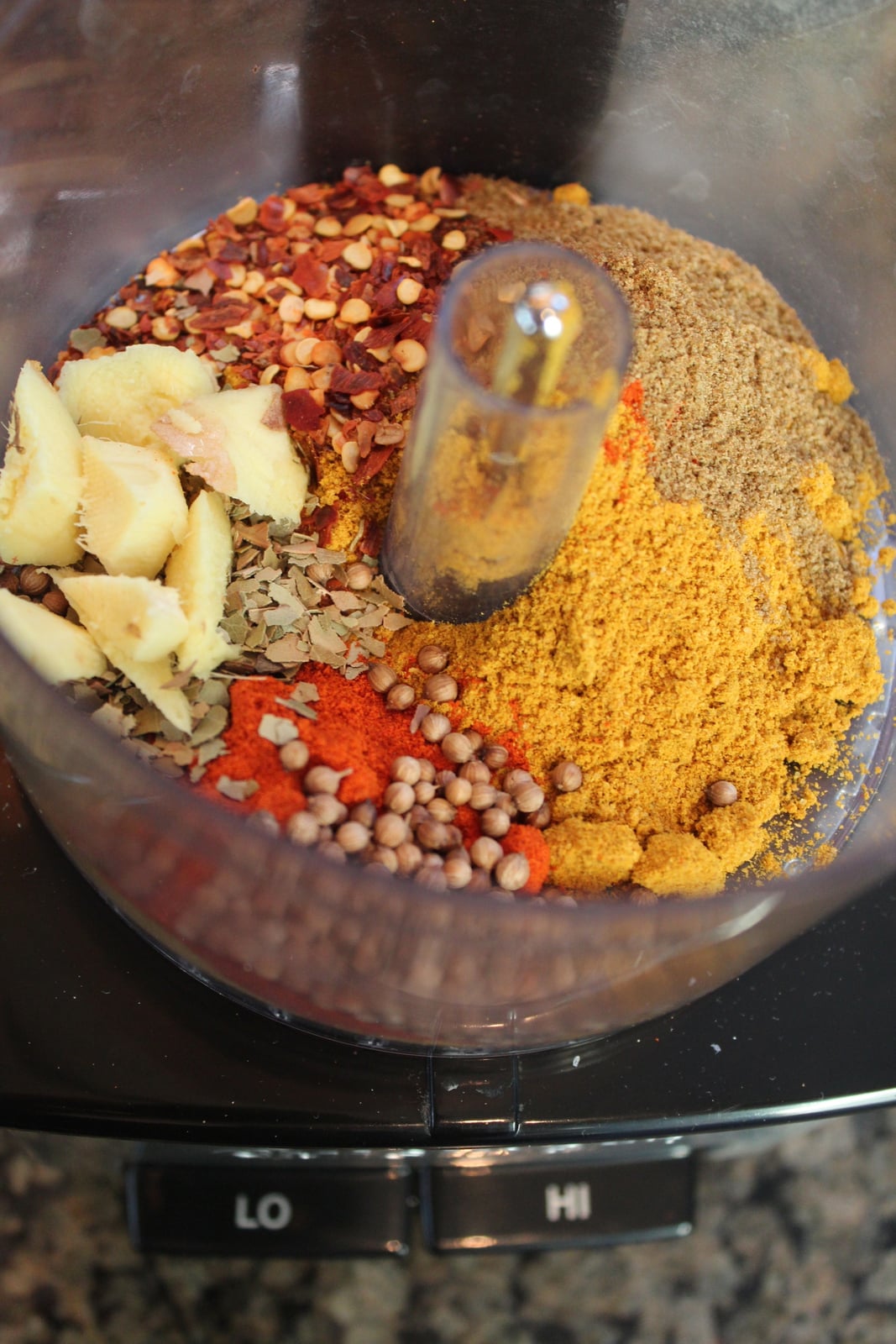 Next, combine the ginger, curry powder, bay leaves, coriander, cumin, paprika, chili powder and red pepper flakes to a small food processor or spice grinder.