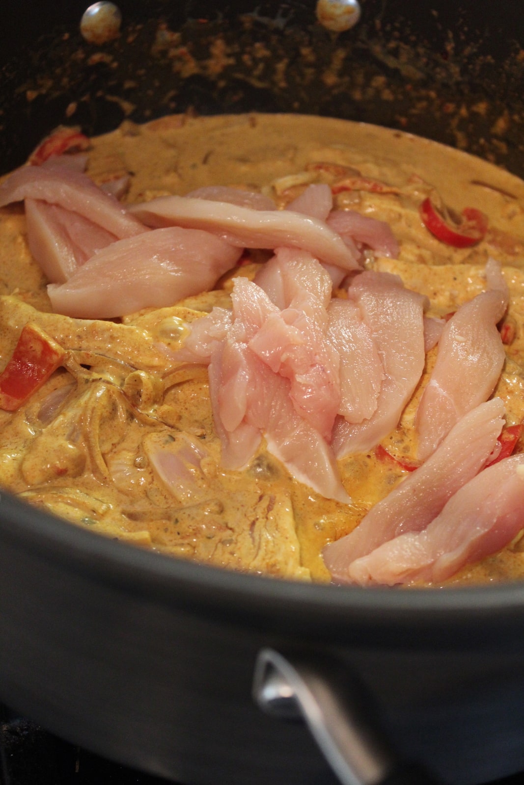 Well now that little secret is out of the bag, lets add the chicken to the curry sauce and vegetables!