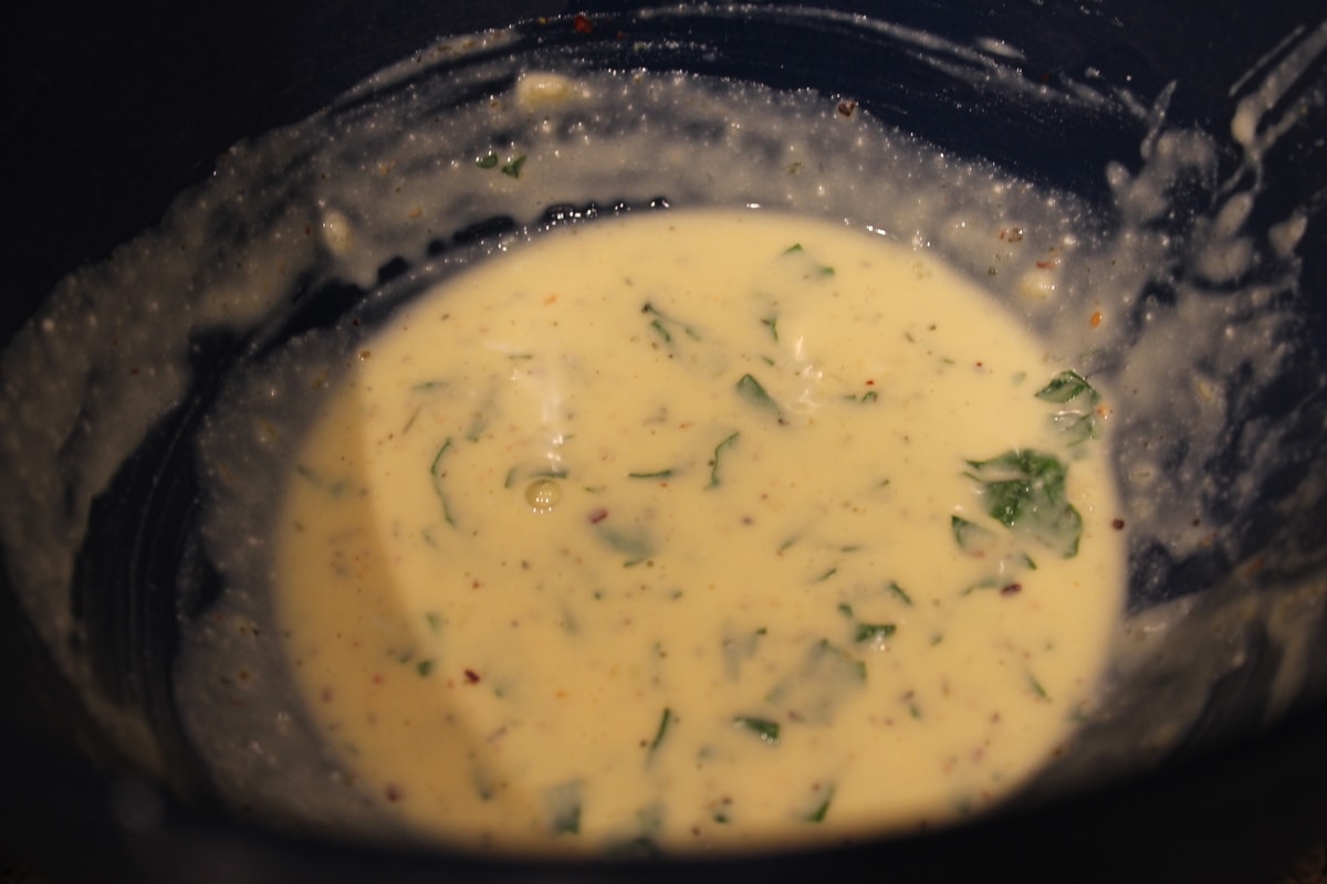 Begin by whisking the ricotta cheese and egg together. Next, mix in the fresh basil, parsley, bell pepper, onion and garlic.