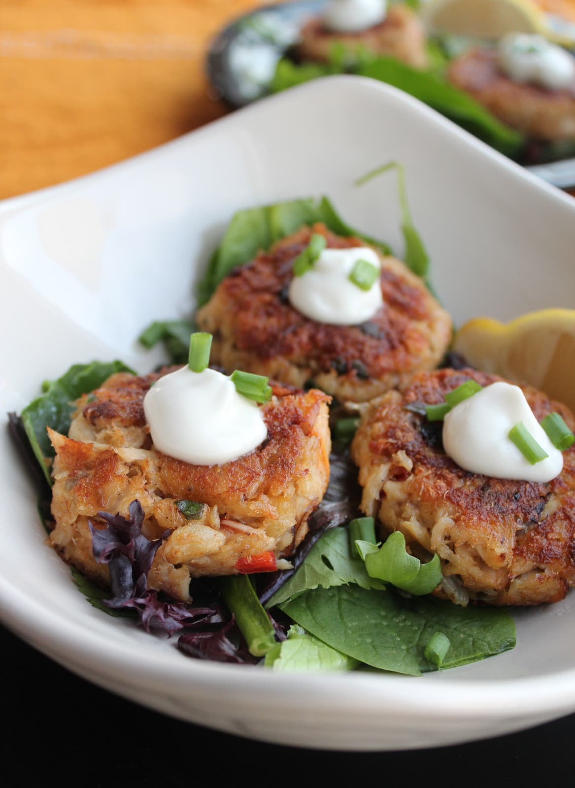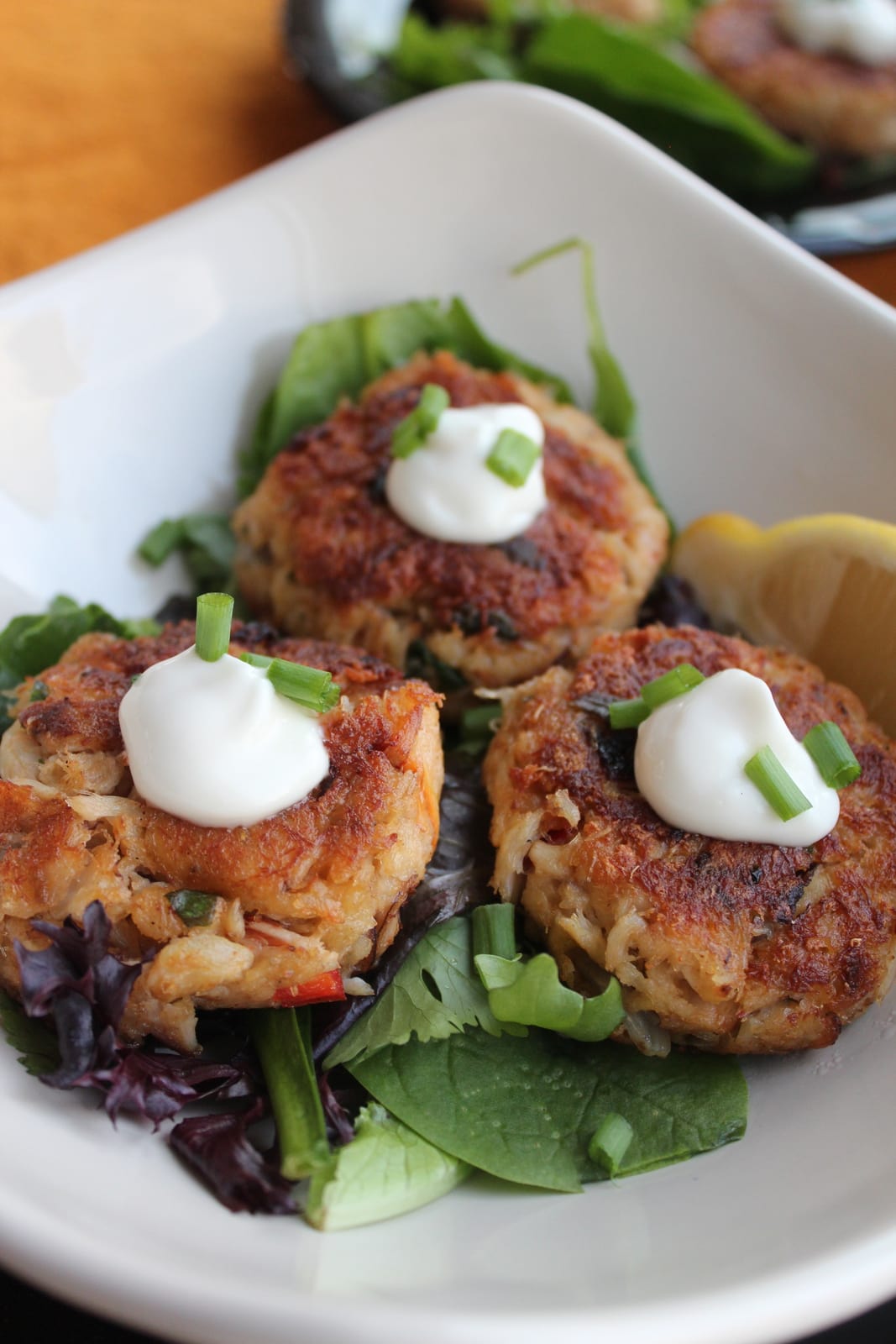 Heat the olive oil in a skillet then add the crab cakes and cook for 3-4 minutes on each side. Remove and serve on a bed of mixed greens, then top with garlic aioli and chives. Serve with lemon wedges on the side.